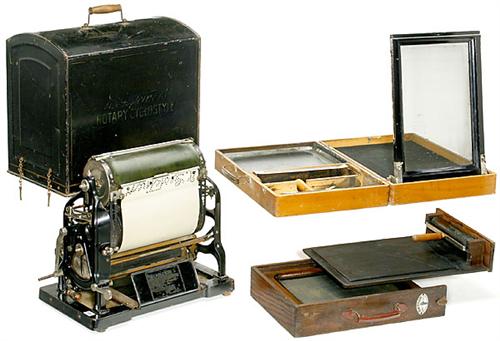 3 Duplicating and Copying Machines, c. 1920 1) Copying apparatus "Dactlyor", in wooden box. - 2) Fast printer "Duplicator à plat" by Geha, no. 45, with box. - 3) Duplicator "Gestetner's Rotary Cyclostyle", with blank stencils.<Br>