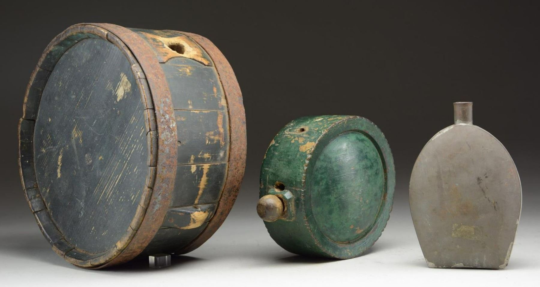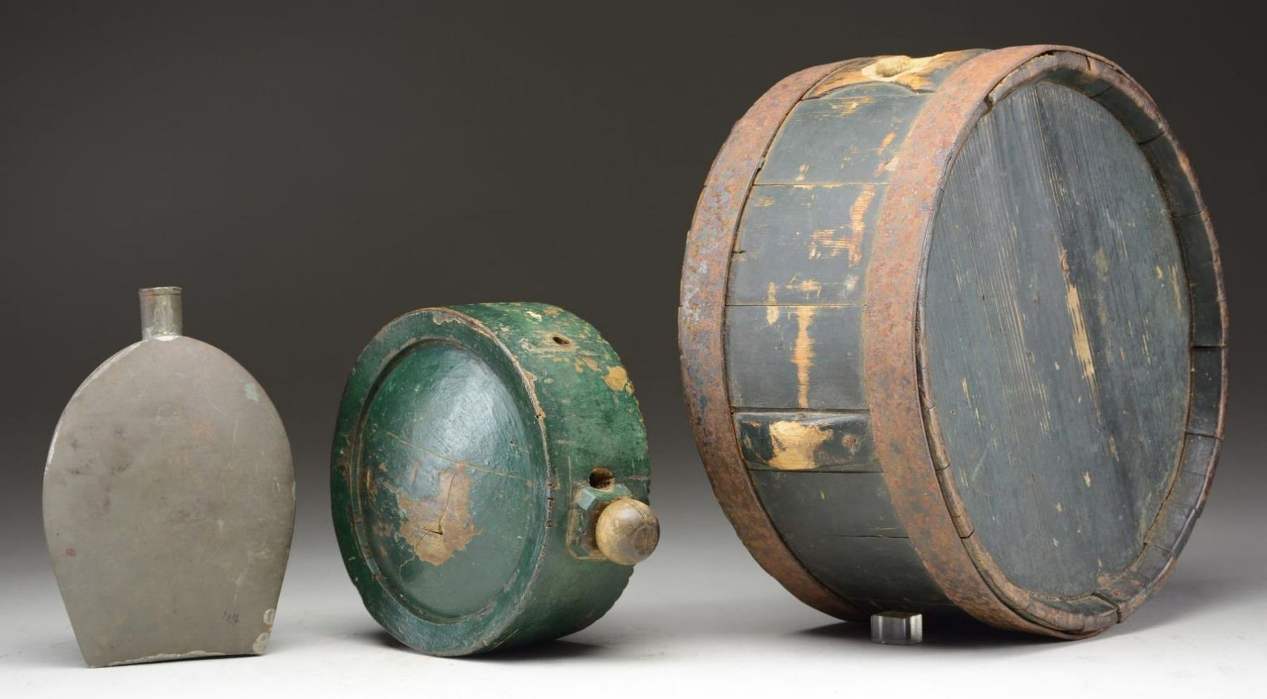 1) This wooden canteen measures 6 5/8” in diameter and is 2 3/4" thick. It is painted green and has a 1-piece outer rim combined with the front & back. The stopper is raised and is of octagonal form with a round top wooden stopper. There are 2 holes on the side of the canteen, possibly to affix a carrying strap, and a breathing hole on the side of the spout. CONDITION: painted surface is about 85%, and there is a crack to one side of the body. 2) This wooden canteen measures 11” in diameter and is 5” thick. It is painted black and has barrel-like stays on the outside ring combined with a 1-piece front & back. There are raised sections on the side to facilitate a carrying rope. 2 Iron rings, similar to a barrel, hold the sections of edge together. It has a spout that is slightly raised with no stopper. CONDITION: painted surface is approx. 80%. The spout has rodent chew marks at the edges. The iron hoops have an oxidized patina. 3) This tin canteen is shaped like a flask and measures 7” in height by 5” at its widest point. It is made with a solid front & back soldered to a 1” side strip. The spout rises 1” from the top and is separately applied. CONDITION: the tin has an overall aged, gray patina. There are no dents in the body of the canteen. (02-20107/BF). $600-900.