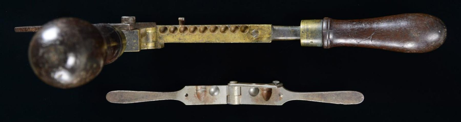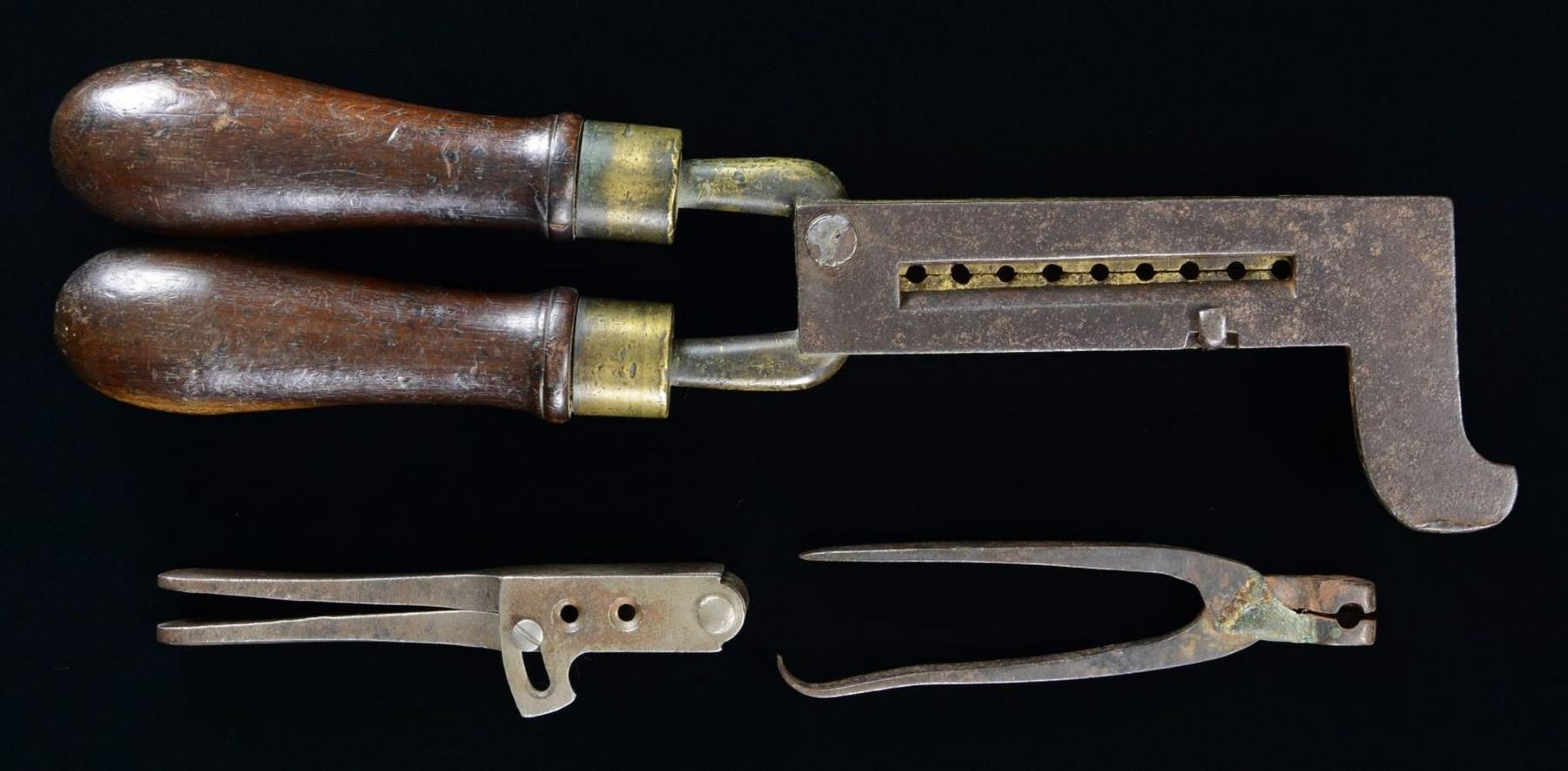 1) A 9-cavity buckshot mold measuring approx. 11 3/4" in length & features a brass body with iron sprue cutter. The mold has 2 turned wooden handles with large brass ferrules. CONDITION: the mold shows wear but is fully functional & complete. 2) An iron 36 Cal. bullet mold is for a Colt pistol. The entire mold, including the sprue cutter, are iron. The 2 cavities are for a conical & round bullet. The sprue cutter is marked “COLT’S PATENT”. CONDITION: iron appears to be heavily cleaned at one point, but has reacquired some patina. 3) An early iron, scissor-type bullet mold of approx. 36 Cal. CONDITION: the entire mold has a dark, oxidized patina. (02-20118/BF). $300-400.