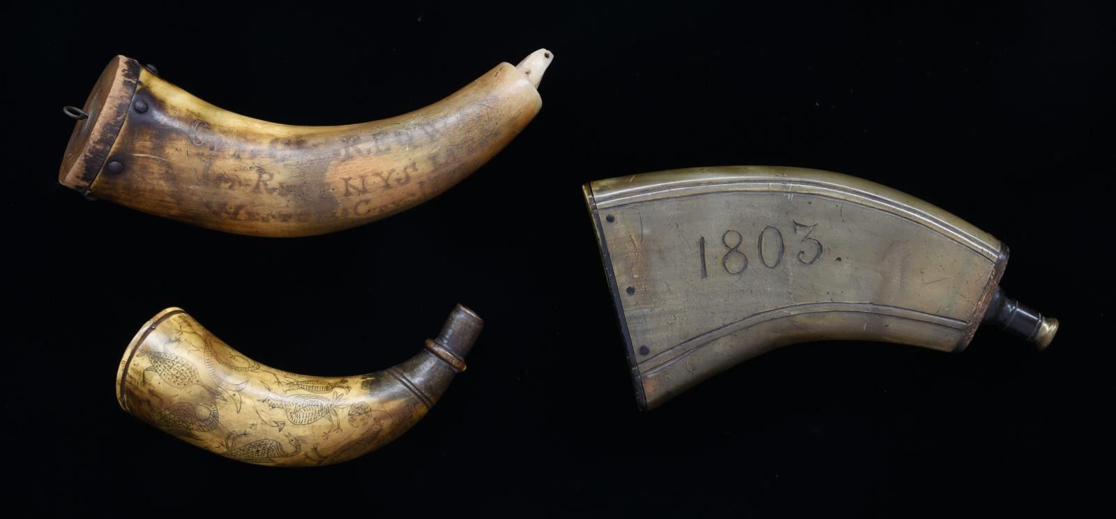 1) Overall length: 9". A fine early American powder horn likely made during the American Revolution. Original engraving on the side of the horn reads "CPT ? GLD ? REQWA 1ST REGT NYS MTA WESTCH ? CTY ? 1778 ?". Spout cap is missing but the wooden butt plug is in place. CONDITION: horn shows light to moderate wear and there is some chipping to the spout. 2) Overall length: 7 1/2". A flattened horn engraved "F. W. DONAUER." & "1803." on the sides. The butt is covered in horn and hand engraved "XIX". Wooden spout with brass lip. CONDITION: light wear overall. 3) Overall length: 6 1/4". A beautiful small horn profusely engraved with a plethora of birds, beasts & fish. There is a centrally located woman on one side and the initials "EH" can be seen near the butt. The style of engraving shows a Pennsylvania Dutch influence. The butt is covered with a piece of horn, and the spout is turned in the normal manner. CONDITION: light wear overall. PROVENANCE: From the Collection of James B. Taylor. (02-19900/BF). $800-1,200.