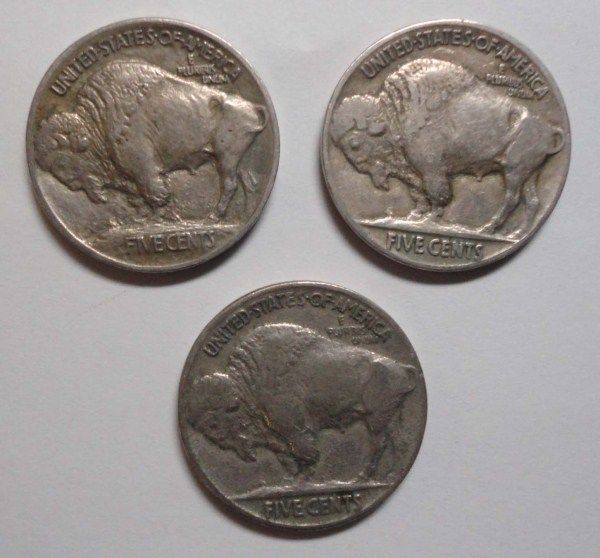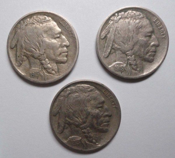 3 EARLY P MINT BUFFALO NICKELS 1913 T1 XF, 1915 VF, 1918 VF/XF