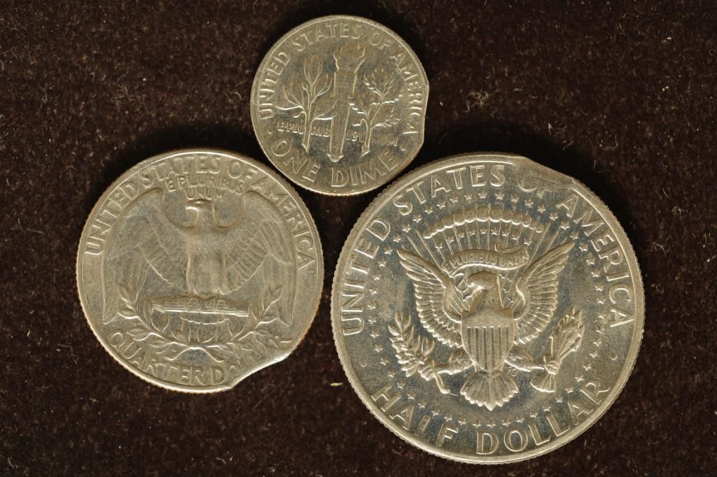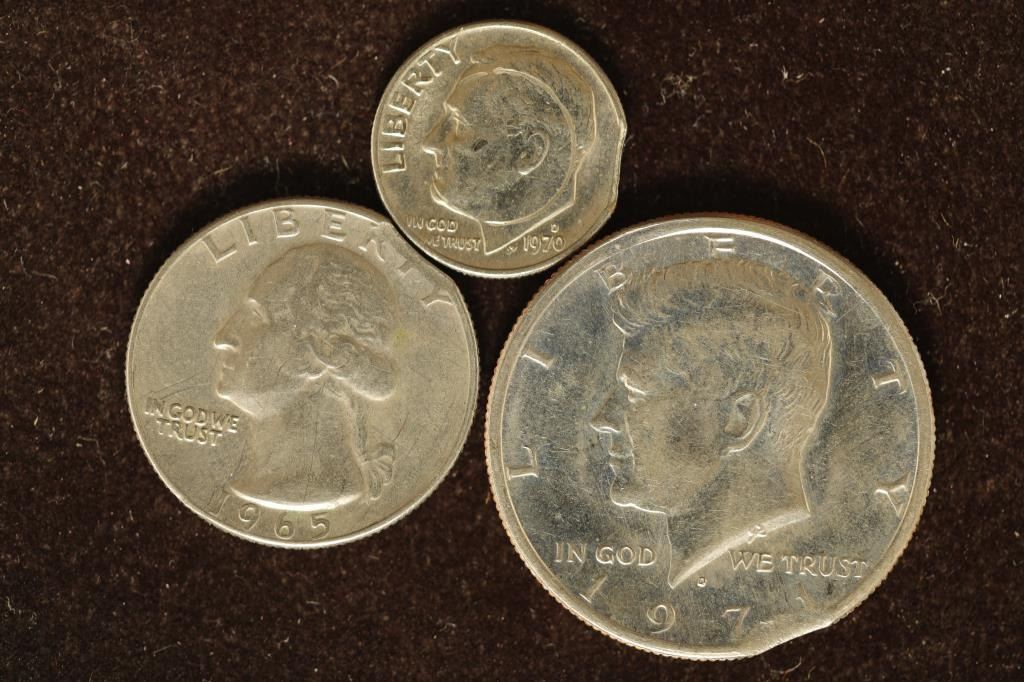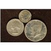 HALF DOLLAR, 1965 WASHINGTON QUARTER AND 1970-D ROOSEVELT DIME
