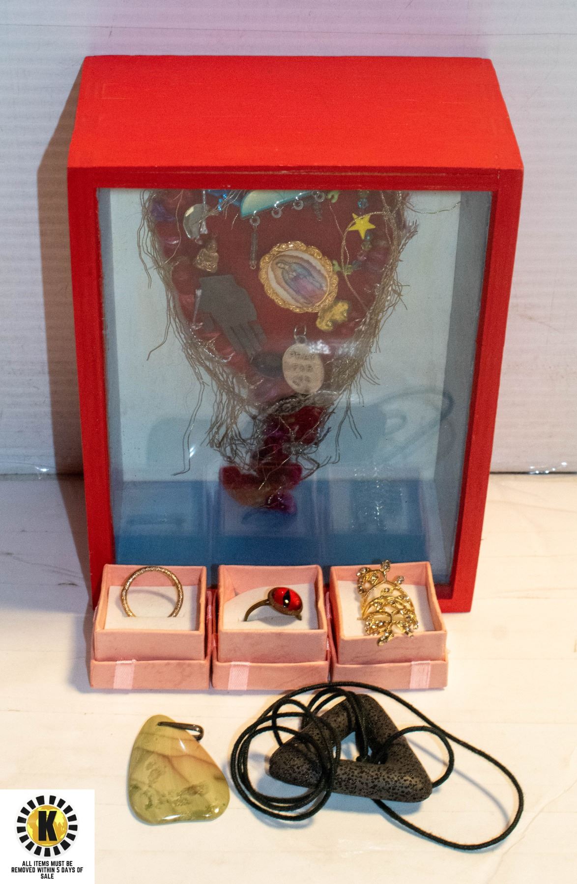 3 ESTATE RINGS IN BOXES, OLD FRAMED GYPSY AMULETS