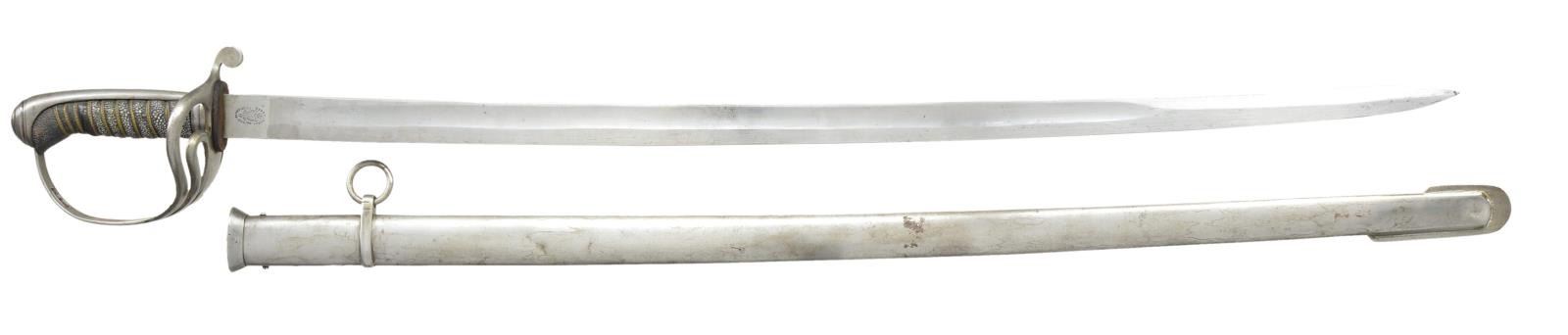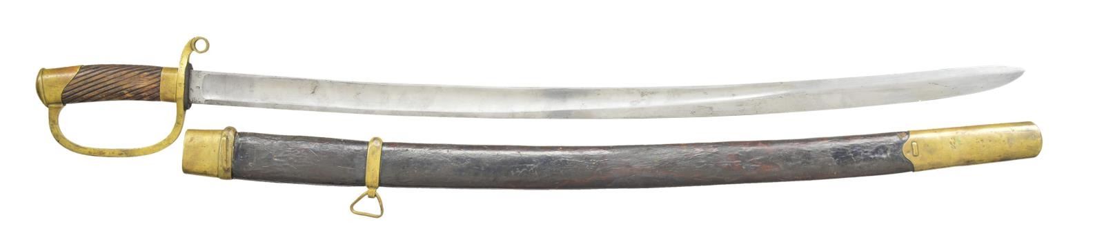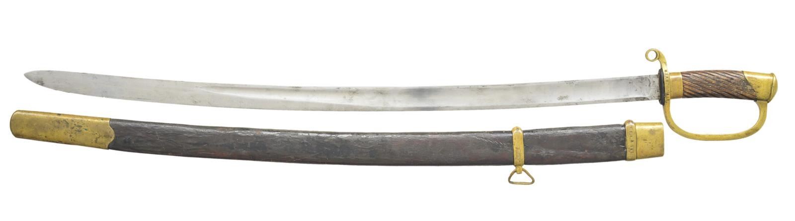 3) RUSSIAN. Overall length: 36”. Blade length: 29 7/8”. Plain blade with a single wide fuller. The ricasso is dated 1887 and is marked with a Russian eagle and words in Cyrillic. There are also several arsenal marks on the ricasso as well as the cross guard. Brass hilt with open quillon. Plain knuckle bow and pommel. Diagonally ribbed wooden grip. Brass mounted leather scabbard with Cyrillic markings at the throat. CONDITION: blade has a light gray finish. Hilt has a pleasing mustard patina. Grip shows appropriate wear. Scabbard mounts have a matching mustard patina. Leather body remains quite solid. (02-16433-1/BF). $600-900.