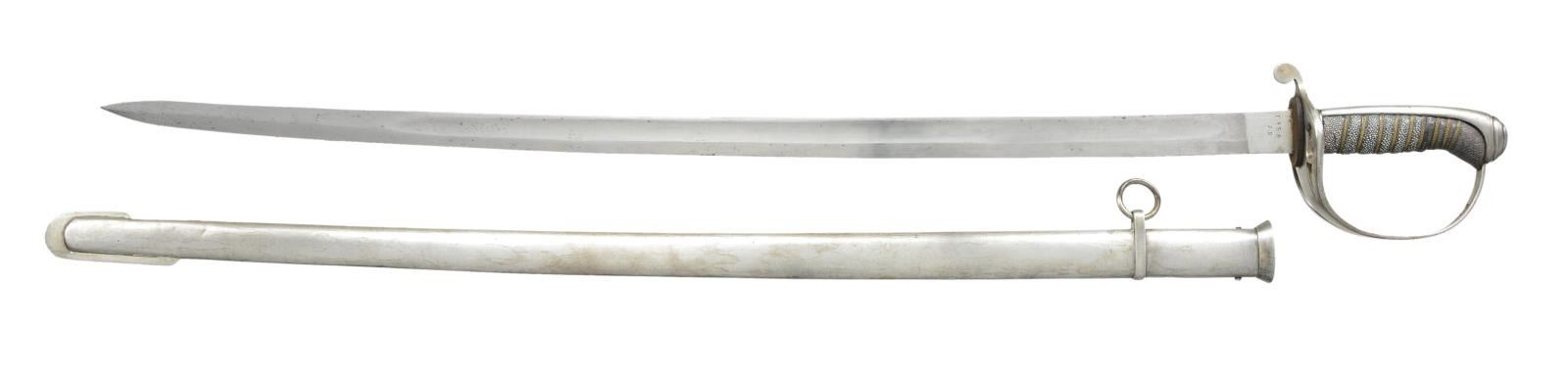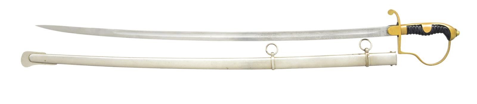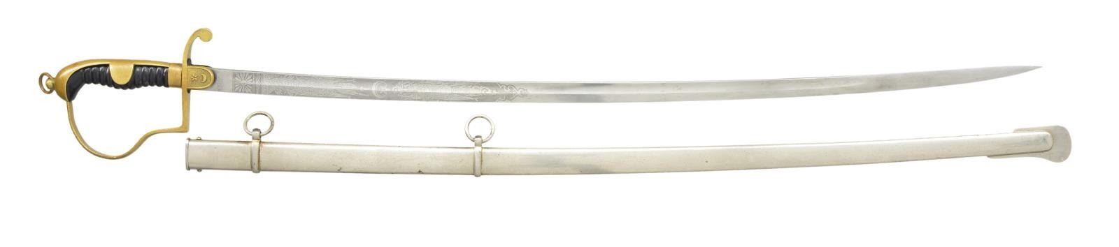 2) TURKISH. Overall length: 37”. Blade length: 30 1/2". Blade has a single fuller and is etched over 1/3 of its length with various patriotic and foliate motifs. Brass hilt with star and crescent on the front languet. Reverse P guard with ears on the backstrap. Birdshead pommel with a lanyard ring at the top. Plated iron scabbard. CONDITION: blade has a light gray patina and etching remains quite clear. Hilt shows light overall wear. Scabbard shows minor spots of oxidation.