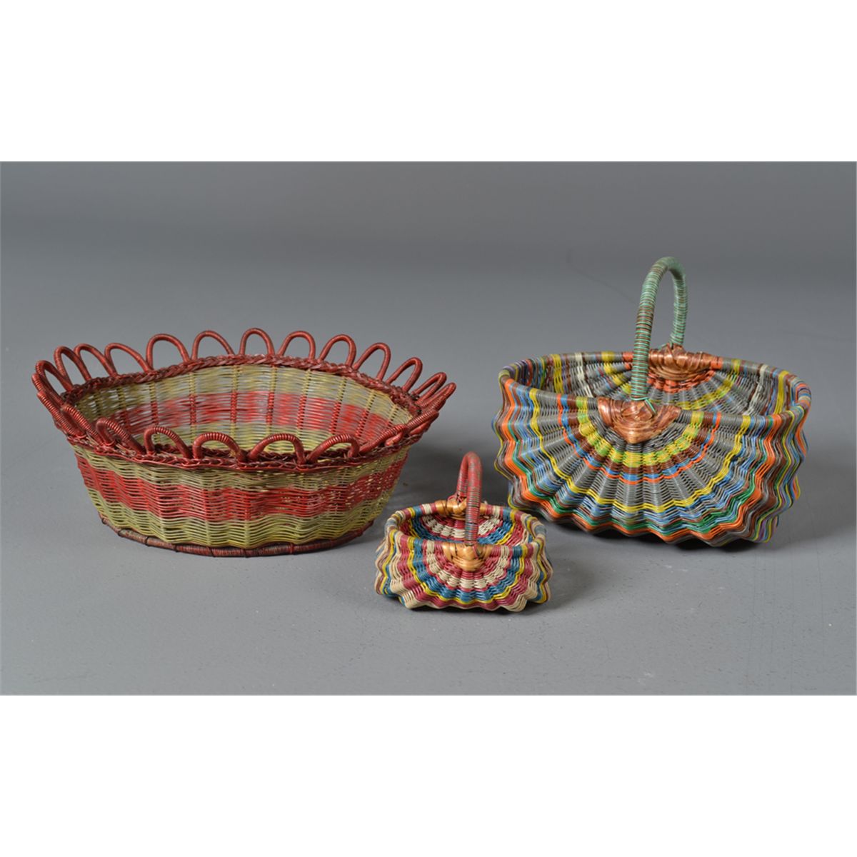 To include two handled baskets and one open basket with scalloped edges all in multicolors. Largest is 9.75" W, early 20th Century. Private collection Gregory, MI.