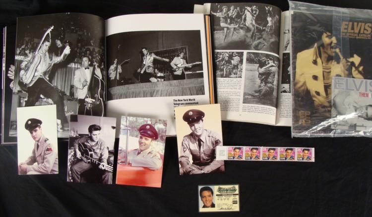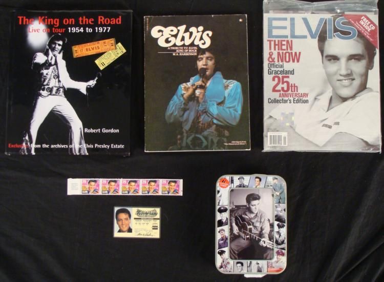 Here are three collectible Elvis books and magazines, plus some bonus cards and stamps. They are in excellent condition to mint condition. This is a great group for any fan of the king! * "The King on the Road: Live on tour 1954-1977" bookAuthor: Robert GordonEdition: 2005Type: Hardcover"Elvis: A Tribute to Elvis, King of Rock" bookAuthor: W.A. HarbinsonEdition: U.S. 1976Type: Soft cover"Elvis: Then & Now" magazine Publisher: Gruner & Jahr USAEdition: 2002, includes free CD Noteables 11 Notecards set in tin collector boxPublisher: Tree-Free GreetingsEdition: 20065 29 cent stamps blockTennessee drivers license souvenir, laminated