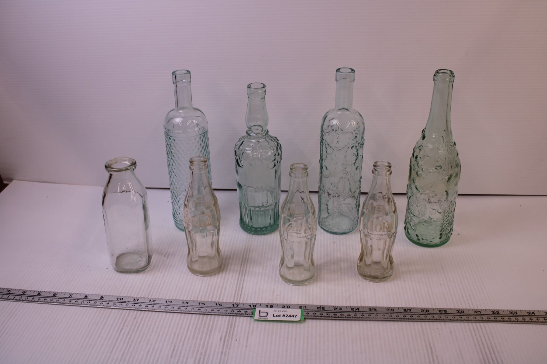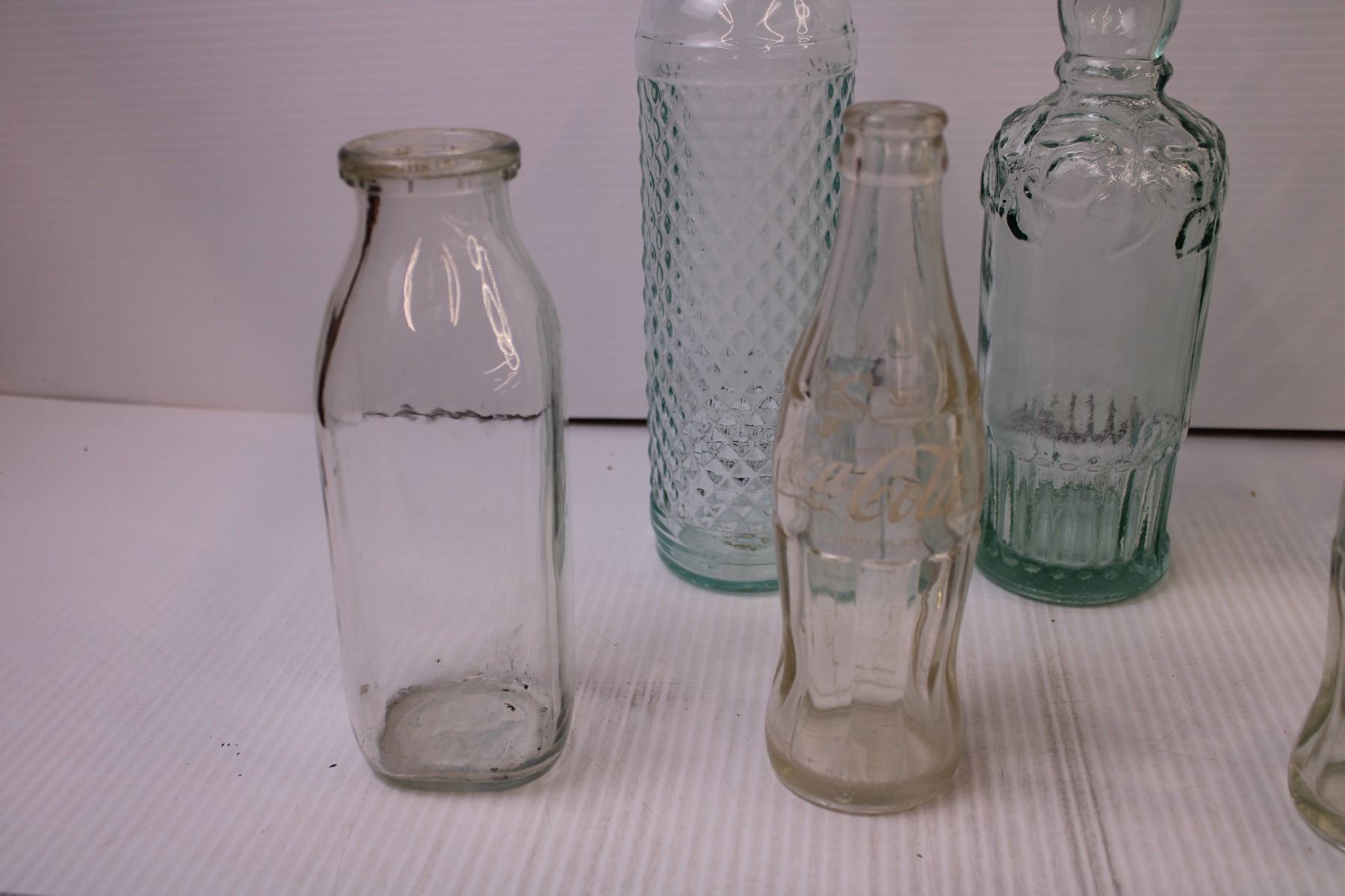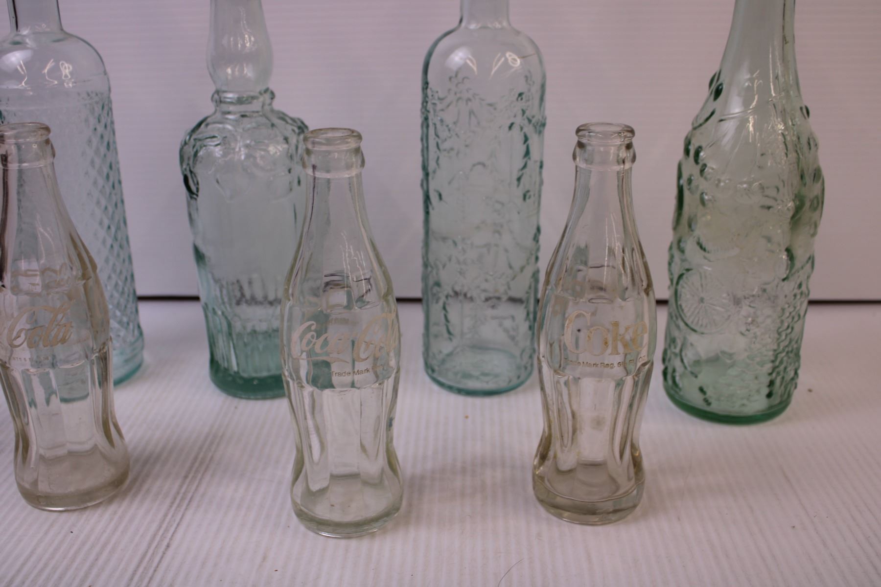 (3) Empty Coca-cola Bottles, (4) Decorative Wine Bottles + Milk Bottle