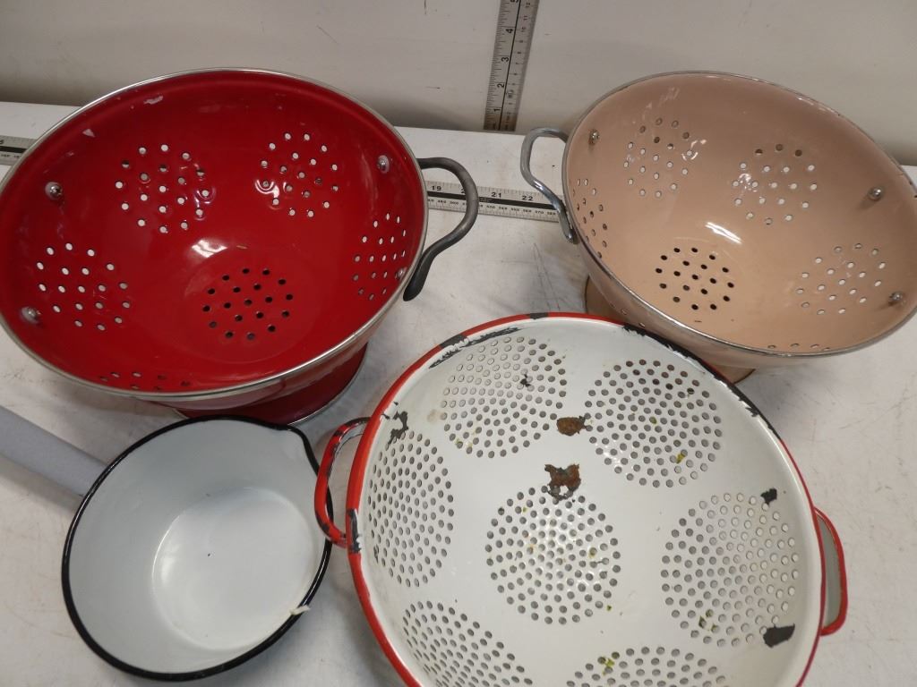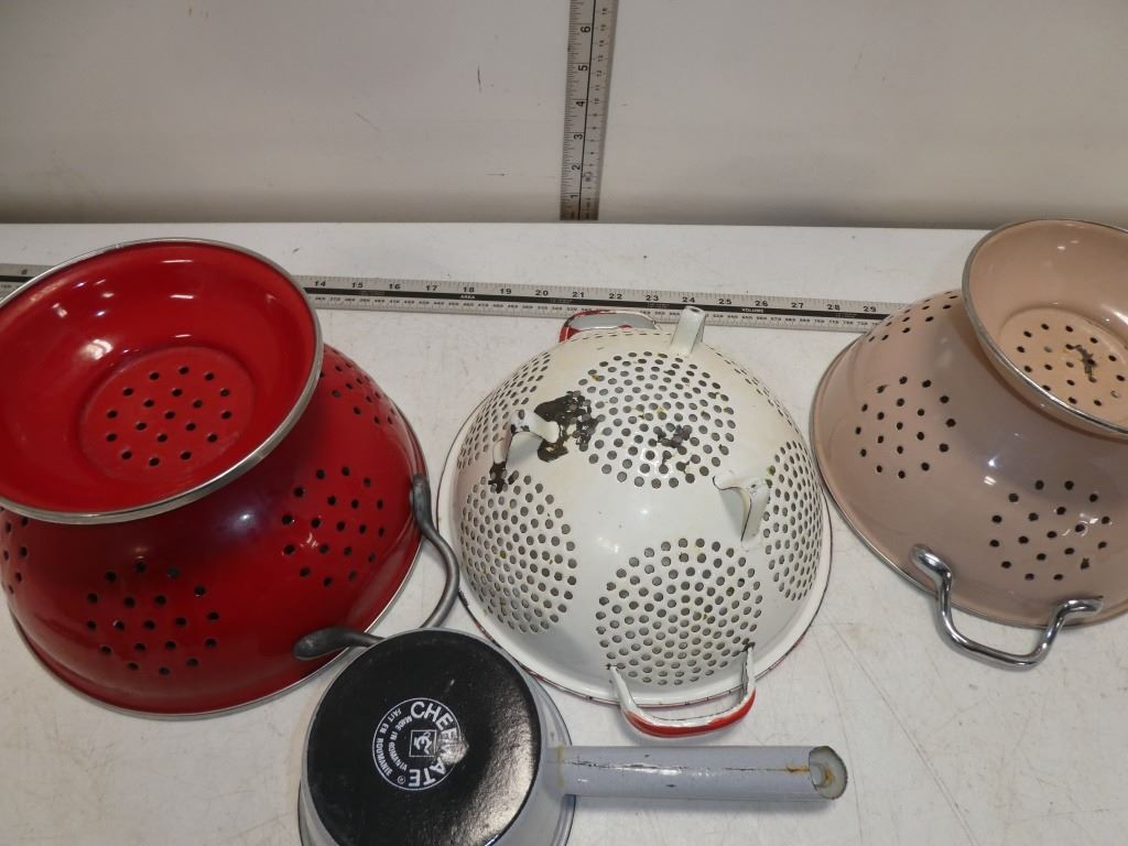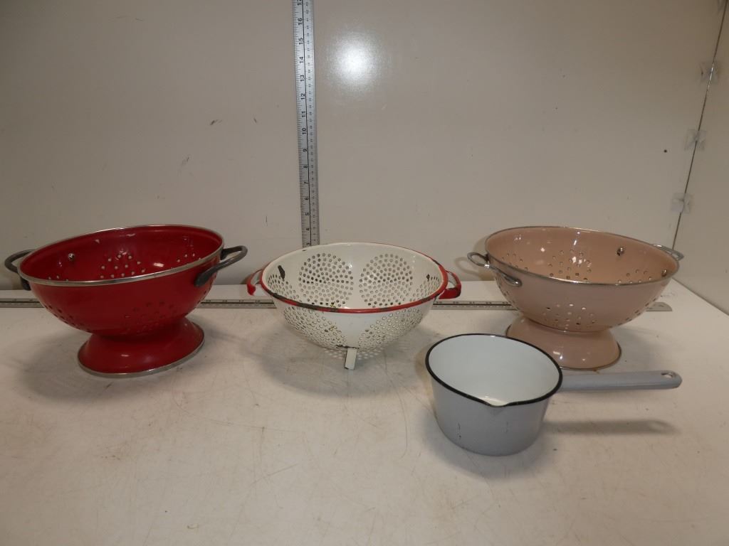 3 Enamel Kolanders and 1 Enamel Saucepan