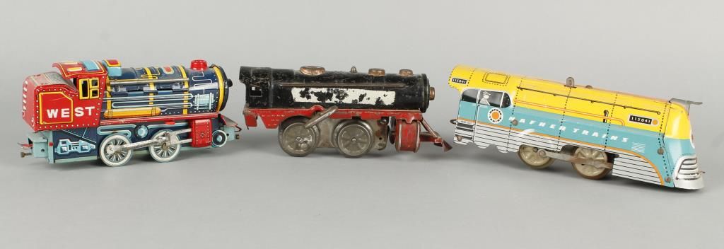 1 vintage wind up style (not working mechanically). 1 marked west, with bright colors, in very nice condition. 1 marked "Kafner Trains", wind up in working condition. Overall good.