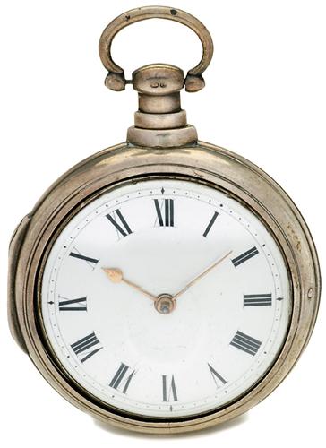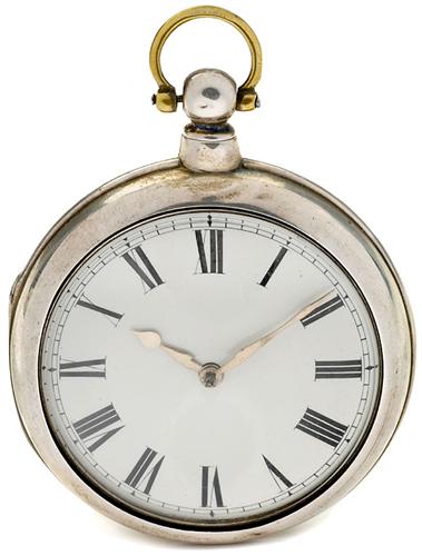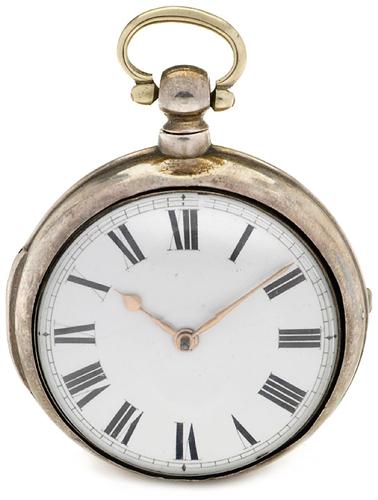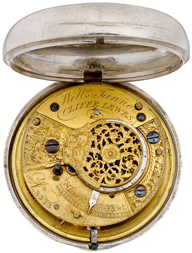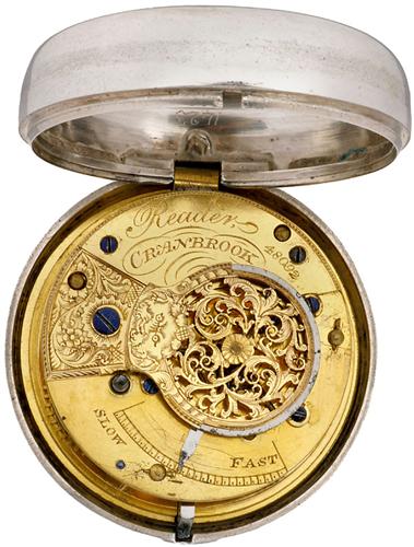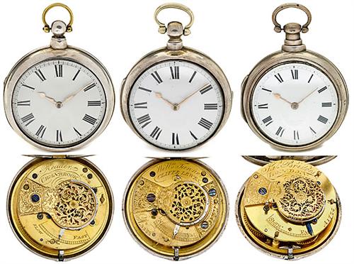 3 englische Spindel-Uhren 1) "Sa. Bridger London", um 1780. Signiertes Spindelwerk mit runden Pfeilern, gestempeltes Silbergehäuse, mit Übergehäuse. Spindelbrücke durchbrochen und graviert mit Blumen und Rankenmotiv. Werk-Nr. A 1705. Gut erhaltenes Emailzifferblatt mit schwarzen römischen Ziffern. - 2) "Reader Cranbrook", 1839-1854. Signiertes Spindelwerk Nr. 48092. Werk mit runden Pfeilern und durchbrochener, gravierter Spindelbrücke. Gestempeltes Gehäuse und Übergehäuse. Emailzifferblatt mit schwarzen römischen Ziffern, vergoldete Zeiger. - Und: 3) "Will'm Tanner Cliffe Lewes", 1835-1855. Spindelwerk signiert Nr. 3333, Werk mit runden Pfeilern, Spindelbrücke durchbrochen und graviert mit Blumenmotiv. Silbergehäuse und Übergehäuse gestempelt mit Hallmarks. Sehr gut erhaltenes Emailzifferblatt mit römischen Zahlen. - Alle Uhren funktionstüchtig!