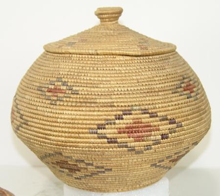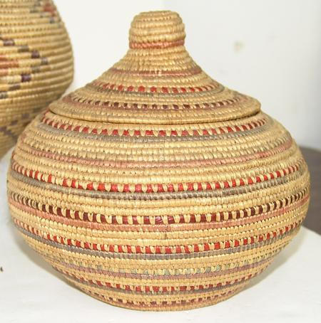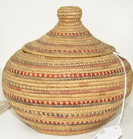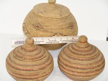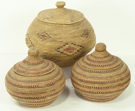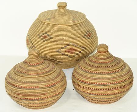 Circa Early/Mid 1900s, Collection of three finely woven lidded baskets done in Hooper Bay style and decorated with fine colored seagrass. All in very good condition. Ex: Frank Curley collection. 8" x 8", 8" x 8", 8-1/2" x 10"
