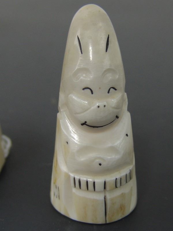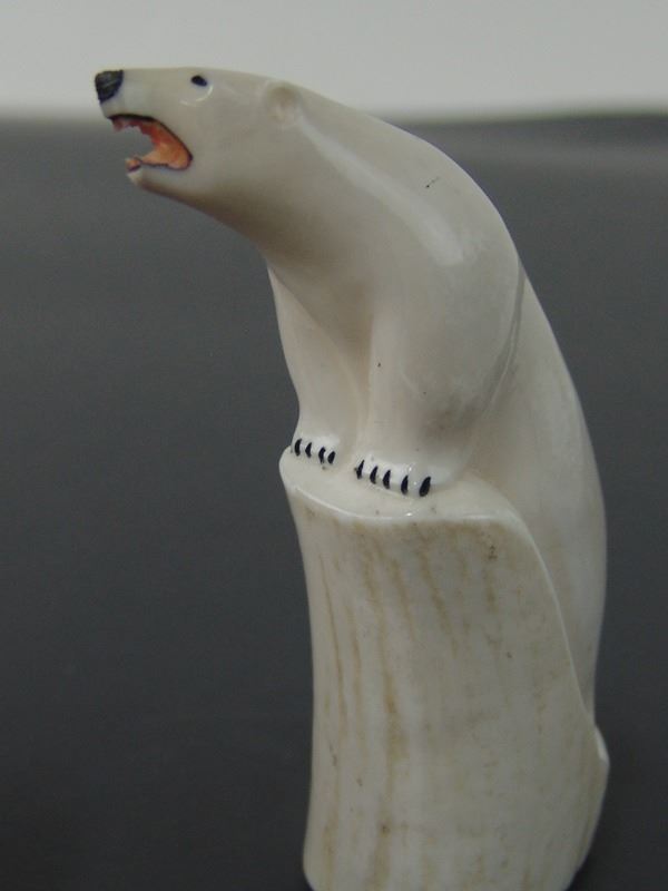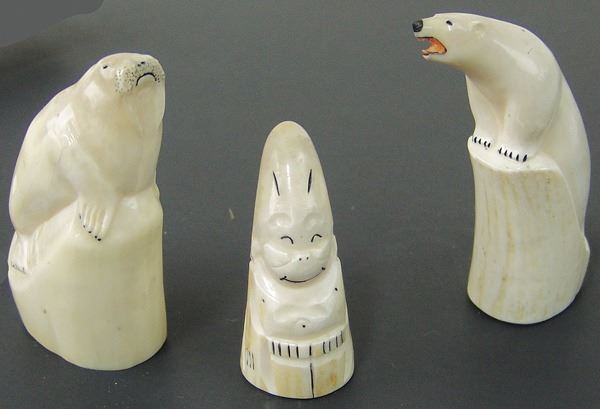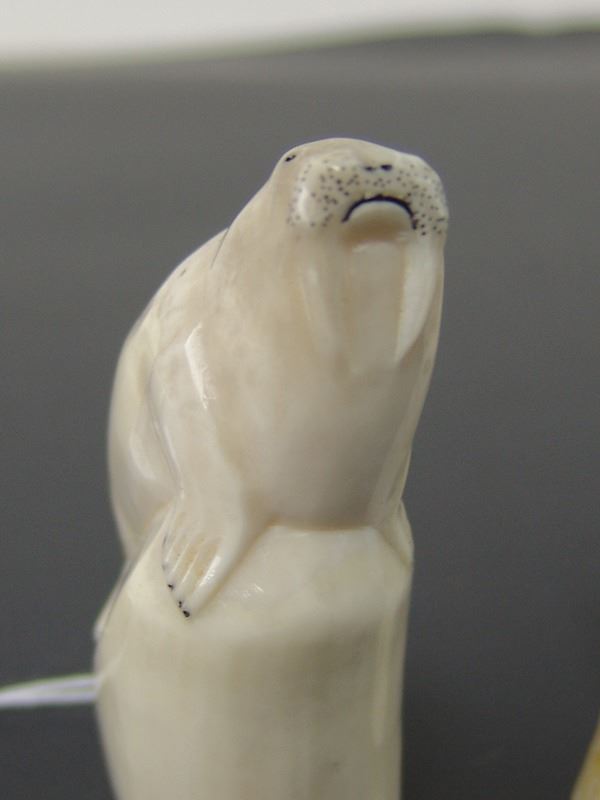 Mid/Late 1900s Largest 3" Group of fine, hand carved ivory figures including a small billiken, a growling upright polar bear, and a upright walrus (signed Wm. Luke.) Very good condition.