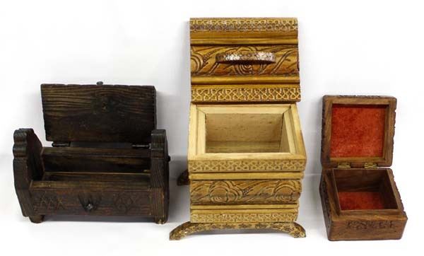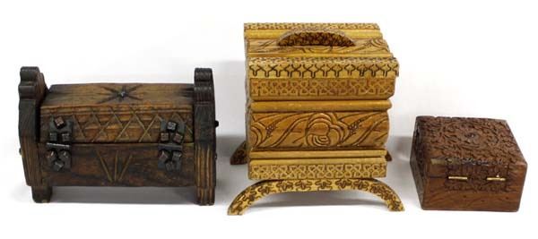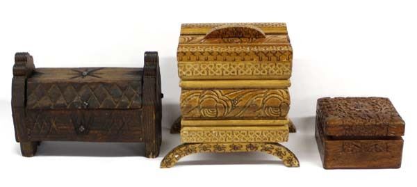 3 Ethnic Lidded Wood Boxes, largest measures 7''H, includes Carved Rosewood Box handmade by skilled artisans from Saharanpur, Spanish Carved Wood Box, and Turkish Carved Wood Box