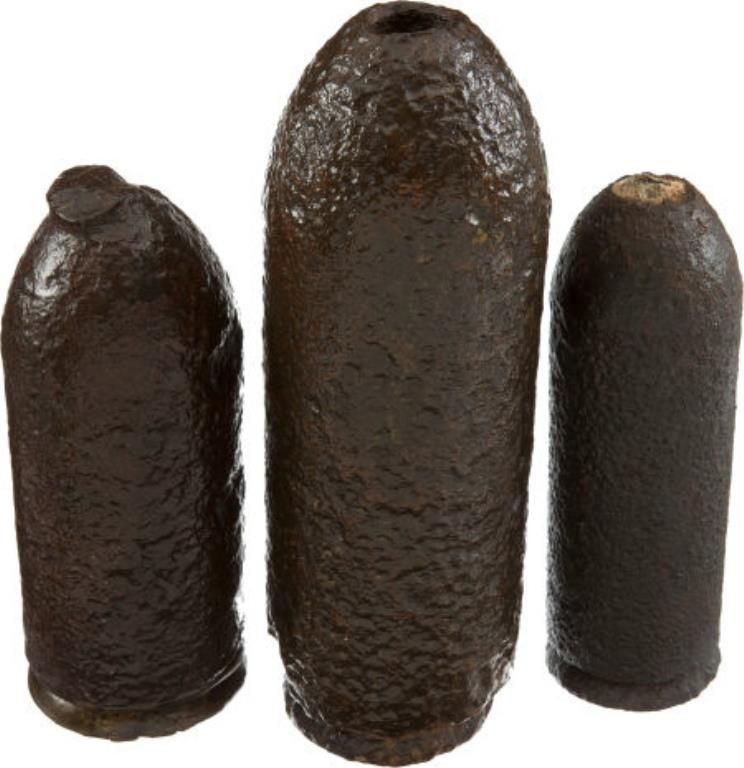 3 Excavated Civil War Parrott Projectiles 1) 20- pounder bolt dug condition with losses to the nose, brass sabot complete, diameter 3 1/2", 8 3/4" length. 2) 10-pounder dug shell, iron sabot, 2 7/8" diameter , 9" length. 3) Parrottt shell, dug, 4 1/4" diameter, 12 1/4" length, losses at the base.
