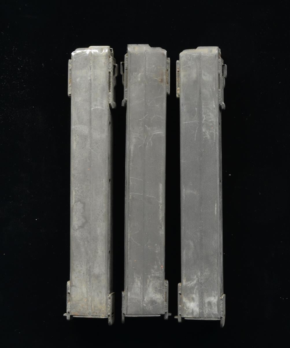 Parkerized mags. that appear to have seen very little use, only 1 exhibits finish wear in the outer feed lip area where it’s under heavy friction & wears fast. Dark, dry parkerized finish w/ light scratching from bulk storage. (02-13776-13/JZ). NONGUN. $450-650.