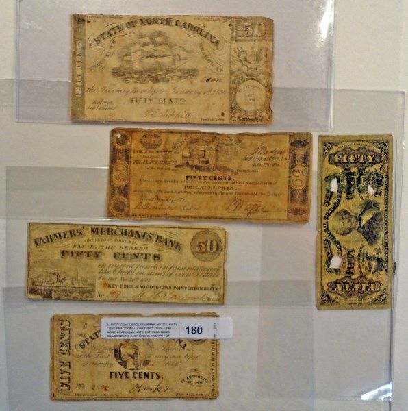 3- FIFTY CENT OBSOLETE BANK NOTES; FIFTY CENT FRACTIONAL CURRENCY, FIVE CENT