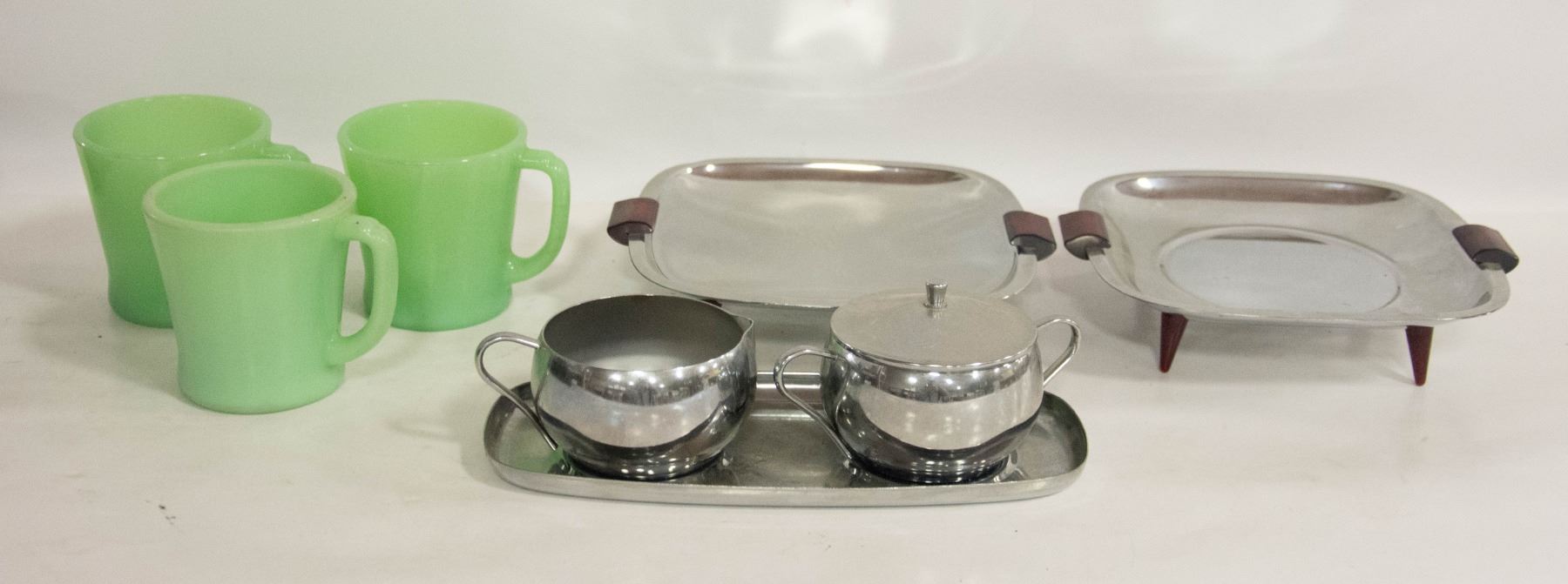 NICKEL PLATED CREAM AND SUGAR WITH TRAY, 2 MID CENTURY MODERN NICKEL PLATED SQUARE SERVING DISHES **ALL ITEMS MUST BE REMOVED BY 5PM SATURDAY, JULY 29TH 2023. ALL REMAINING ITEMS WILL BE SUBJECT TO A $6.00 PER DAY STORAGE CHARGE. ANY ITEMS REMAINING AFTER MONDAY, AUGUST 14TH, 2023 WILL BE CONSIDERED FORFEITED. NO REFUNDS WILL BE ISSUED FOR FORFEITED ITEMS. TO SCHEDULE A PICK UP APPOINTMENT CLICK HERE