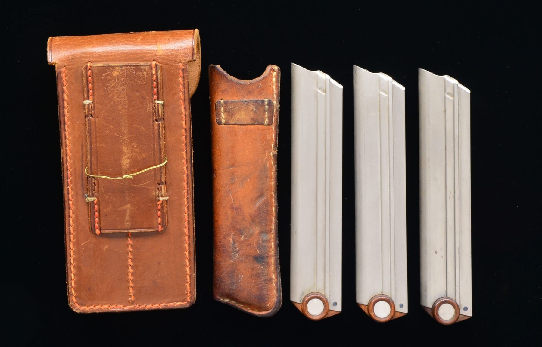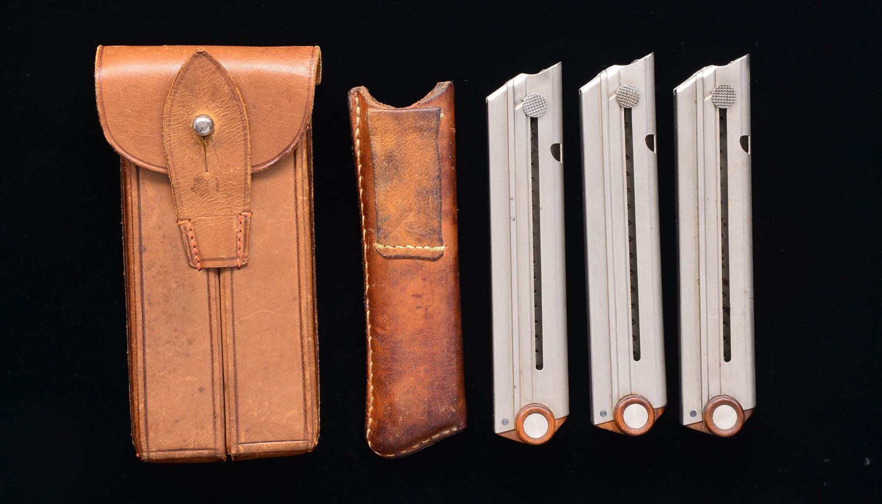 Near excellent 8 rd. Model 1900 Swiss magazines w/ early flat, checkered loading buttons. Bases have disks in dimples & retained by single niter blued pin. Double magazine pouch similar in appearance to more common Portuguese models that were black. Light to medium brown w/ stud & strap retention; nickel plated stud on closure flap & short retention tab. Long wide belt loop w/ added light gauge brass dbl. wire loop. Very well blocked & minimal marks or wear. Single magazine pouch w/ open top & belt loop on back appearing more for dress belt than military. Likely used for concealed carry. Small loop on front as if for closure tab. Numerous light marks & slight discoloration. PROVENANCE: From the esteemed collection of Paul Regnier, Switzerland. (02-13758). $3,000-4,000.