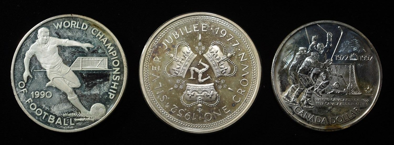 1977 ONE CROWN SILVER JUBILEE, 1990 $25 JAMACA FOOTBALL, 1997 CANADA DOLLAR HOCKEY ESTIMATE $100 - $150.