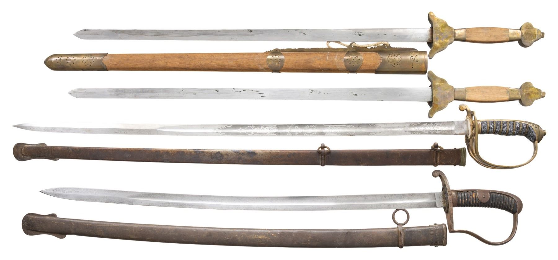 1) A Chinese double sword or shuang jian with an overall length of 37 1/2" and blade lengths of about 28". The blades are identical except one has and engraved dragon with Chinese writing and the other has a phoenix with Chinese writing. The hilts have a shaped brass guards, brass ferrules and a shaped brass pommels along with wooden grips. Brass mounted wooden scabbard fits both swords at once. CONDITION: light wear overall. 2) A German/Austrian blucher type saber measuring 37 1/4" overall with a 30" plain blade with a single wide fuller. The ricasso is stamped "GEBR. WEYERSBERB SOLINGEN.". Iron hilt with down turned quillon and regimentally stamped crossguard. Plain backstrap with ears and plain birds head pommel. Leather wrapped grip with iron scabbard. CONDITION. blade has a light gray patina. hilt has a dark patina with minor losses to the leather grip. Scabbard has a dark patina with a few shallow dents. 3) British P1845 infantry officer's sword measuring 39 3/4" overall with an etched 33" blade. Blade is etched with foliate motifs along with a crowned "VR" on both sides. Gilded brass hilt with a pierced guard highlighted by a crowned "VR" in an oval. Wire wrapped sharkskin grip and brass mounted iron scabbard. CONDITION: blade has areas of original factory polish. Hilt shows light overall wear. Scabbard has an oxidized finish with patinated mounts. Sword does not fit scabbard well due to an obstruction near the tip. (02-24163/BF). NON-GUN. $500-800.