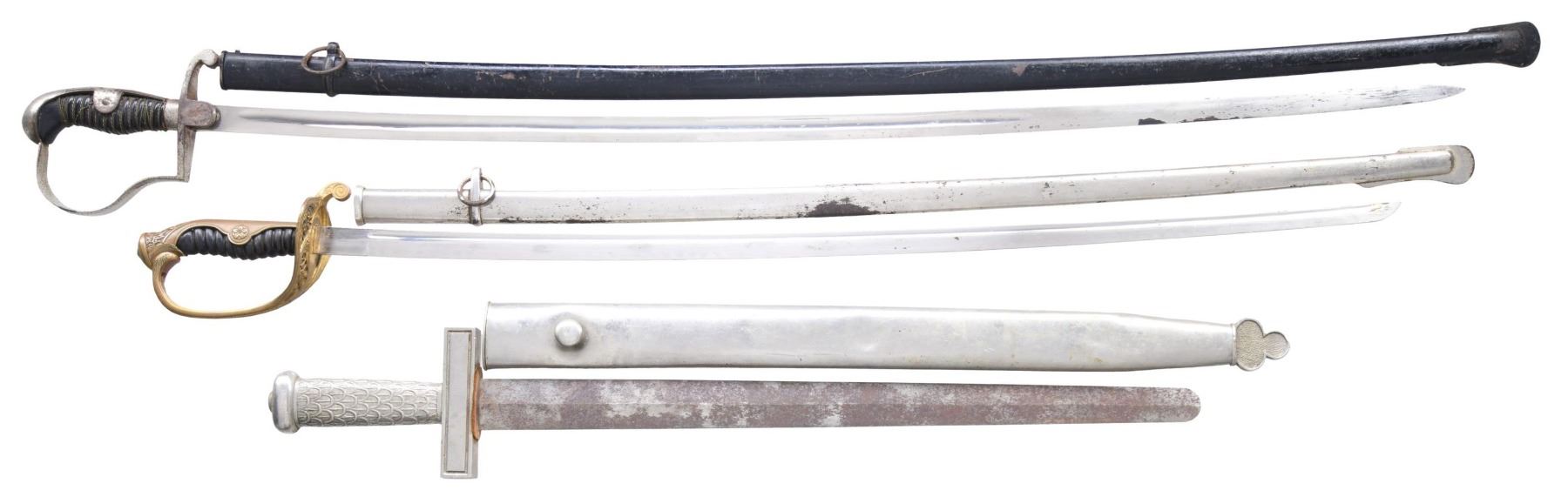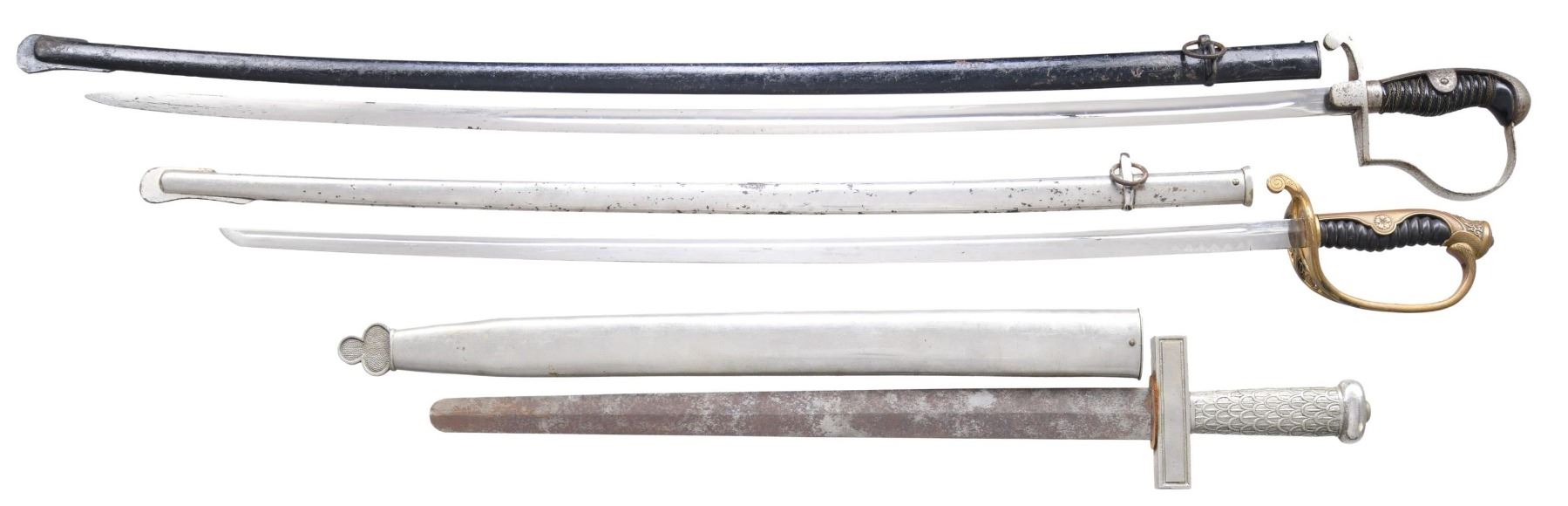 1) JAPANESE. A Japanese army officer’s parade saber measuring 35 3/4" overall with a 29 1/8" blade. The plain blade has a single narrow fuller. Gilded brass hilt with a pierced guard and 10-petal cherry blossom on the backstrap. Composite grip and plated iron scabbard. CONDITION: blade shows some original factory polish. Hilt shows light wear but has no wire. Scabbard shows spotty oxidation. 2) GERMAN. An artillery officer’s saber measuring 41" overall with a 35 1/4" blade having a single medium fuller. The blade is marked near the hilt "(knight’s head) WKC." Plated iron hilt. Wire-wrapped composite grip. Black enameled iron scabbard. CONDITION: blade shows substantial original factory polish with some areas of oxidation near the tip. Hilt shows moderate wear with some oxidation. Grip is 100%, but a few pieces of wire are missing. Scabbard shows light wear. 3) FRENCH. A good example of a French musician’s short sword measuring 27 3/4" overall with a 19 1/2" blade with a rounded tip. The plain blade is unmarked but has a raised medial ridge. Plated hilt with a heavy crossguard and fish scale-type grips. Plated scabbard with a clover-like motif at the drag. CONDITION: blade has a mottled, oxidized patina. Hilt and scabbard show light wear. (02-23418/BF). NON-GUN. $400-550.