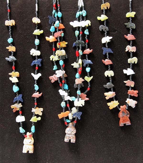3 Hand Carved Stone Fetish Necklaces designed by Kills Thunder , 1- Double Strand, measures approx. 19'' end to end, pendant measures 1.5''L. 2- Single Strand Necklaces. Hand strung & designed by artist Kathy Kills Thunder.