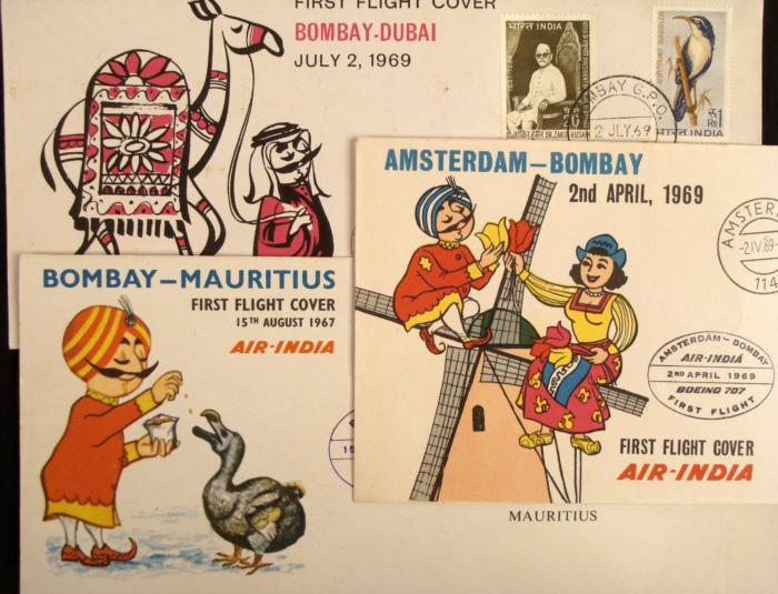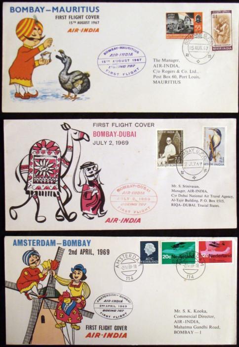 These are 3 first flight covers from Air India. They include Bombay to Mauritius (1967), Amsterdam to Bombay (1969), and Bombay to Dubai (1969). They are in excellent condition.