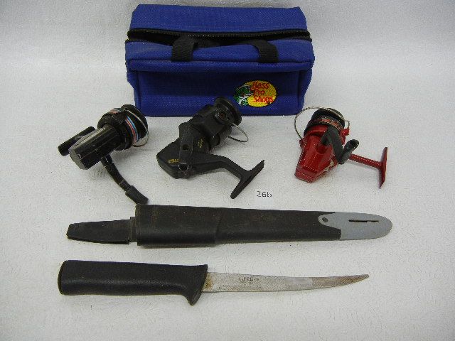 3 Fishing Reels, Gerber Knife w/ Broken Tip