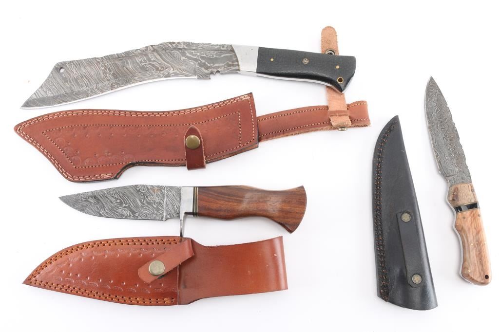 (1) Unmarked, Kukri styled. Measures 15" overall with 8" sharpened edge. Black handle of unknown material. (1) Marked "HK" & "HTS 63" on blade. Large curved wood handle. Measures 10.5" overall with 5" sharpened edge. & (1) Marked with an intertwined "SF" on the blade. Measures 9" overall with a 4.5" sharpened edge. Stained wood handle.