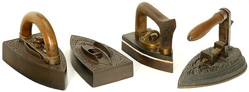 3 Flat Irons (Cold Handles) 1) Two-piece with additional bottom part, marked "F. S. Kustermann - Eisengießerei München", length each 7 1/2 in. - 2) Two-piece, with unusual brass mechanism, length 6 in. - And: 3) Two-piece, florally decorated cast iron, length 7 3/4 in.<Br>