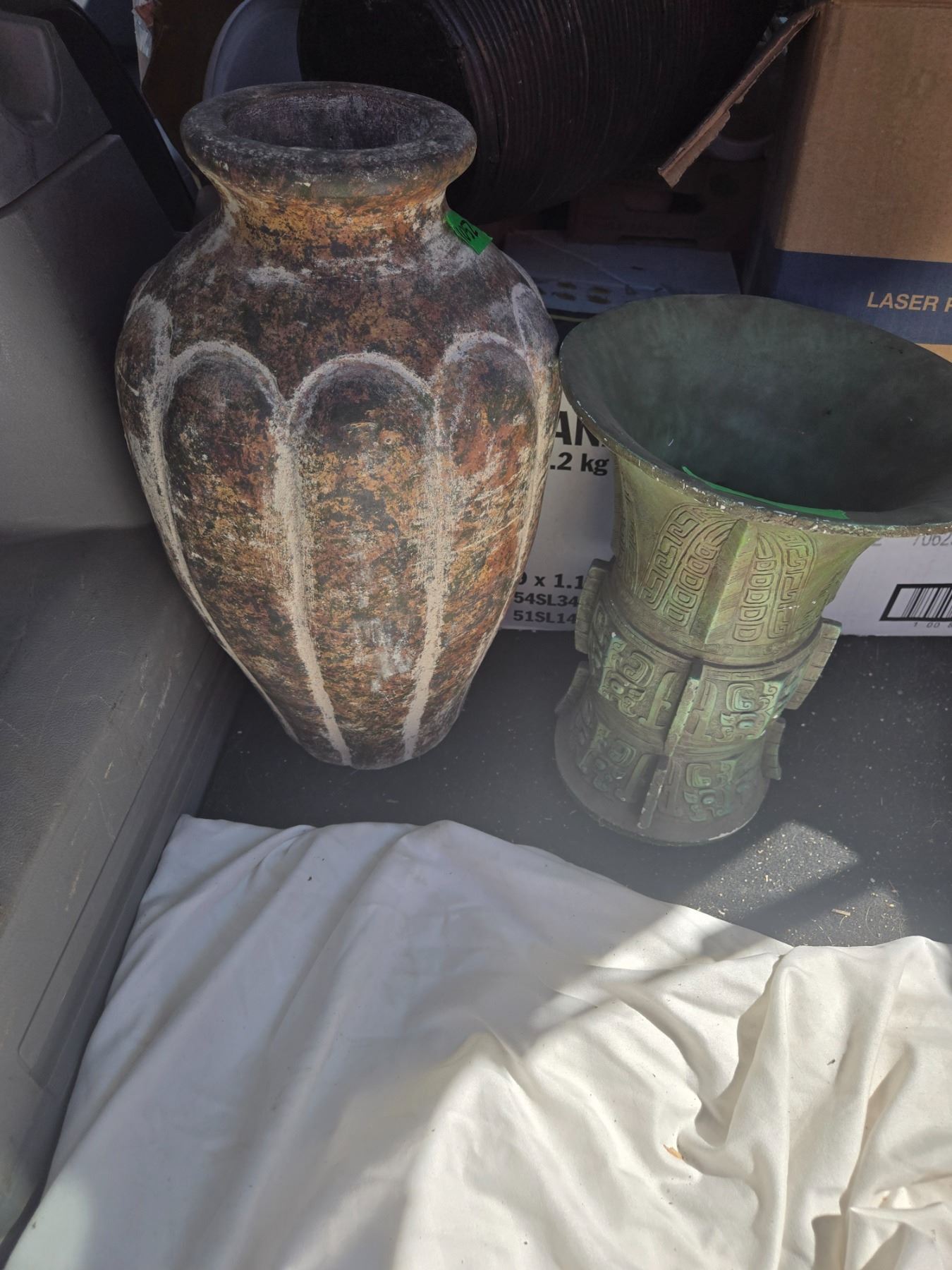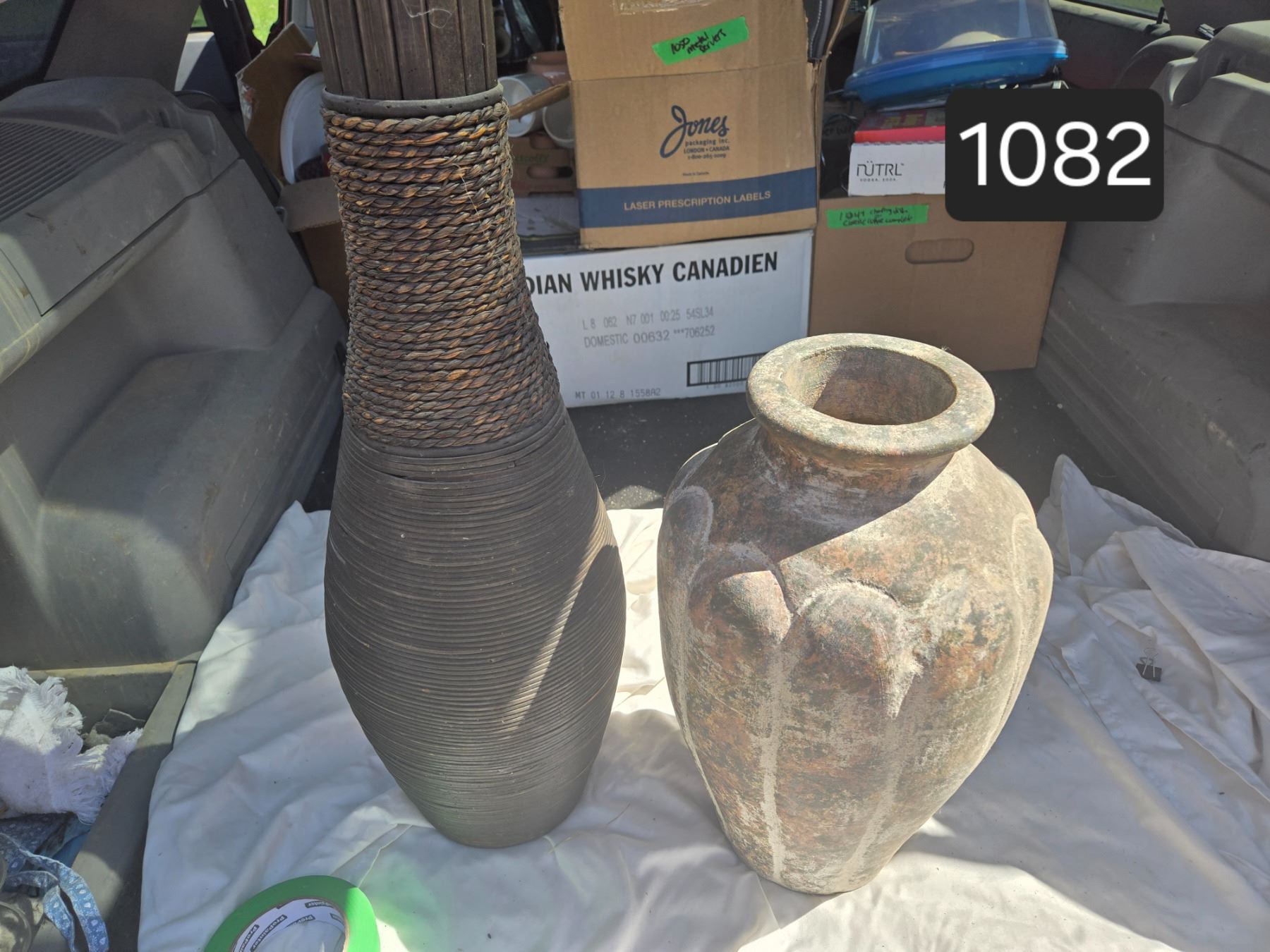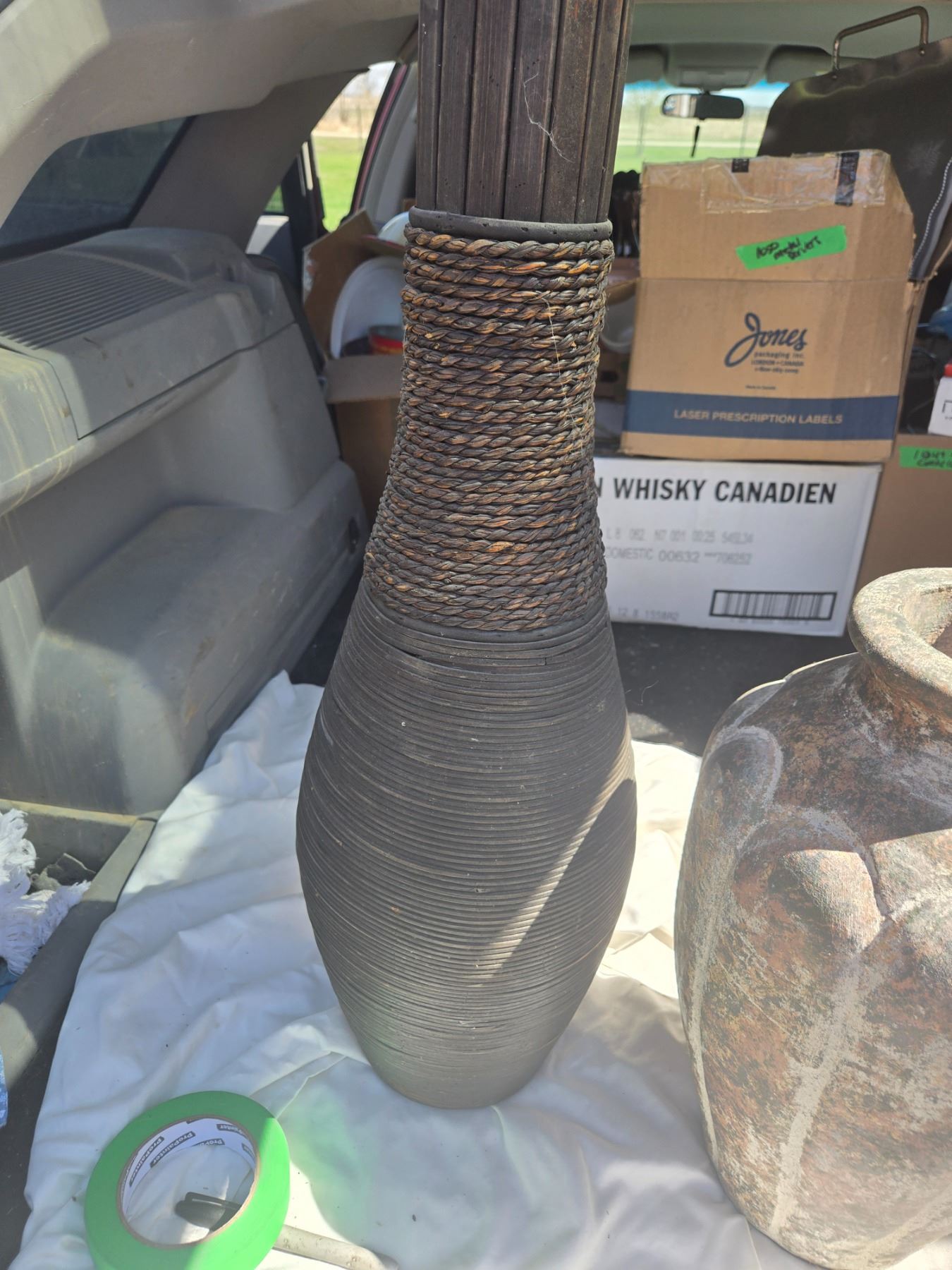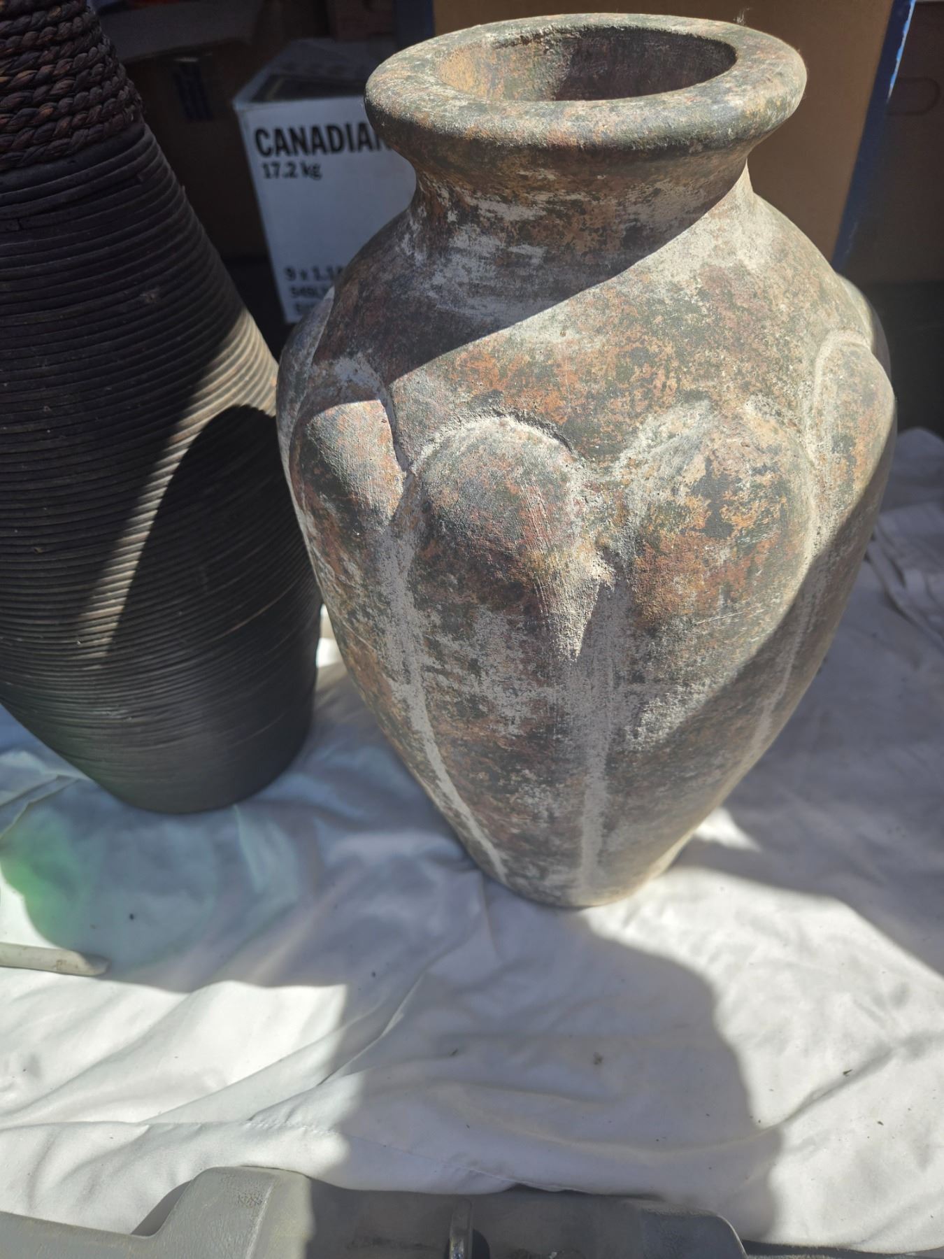 3 Floor Vases – 2 heavy 1 light. Plaster of Paris, Clay and Rattan. For Dried Arrangements