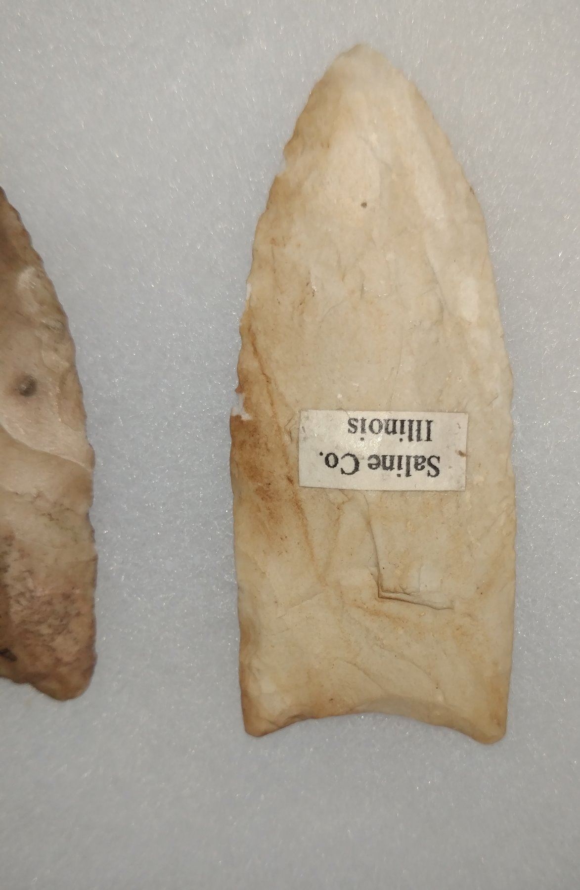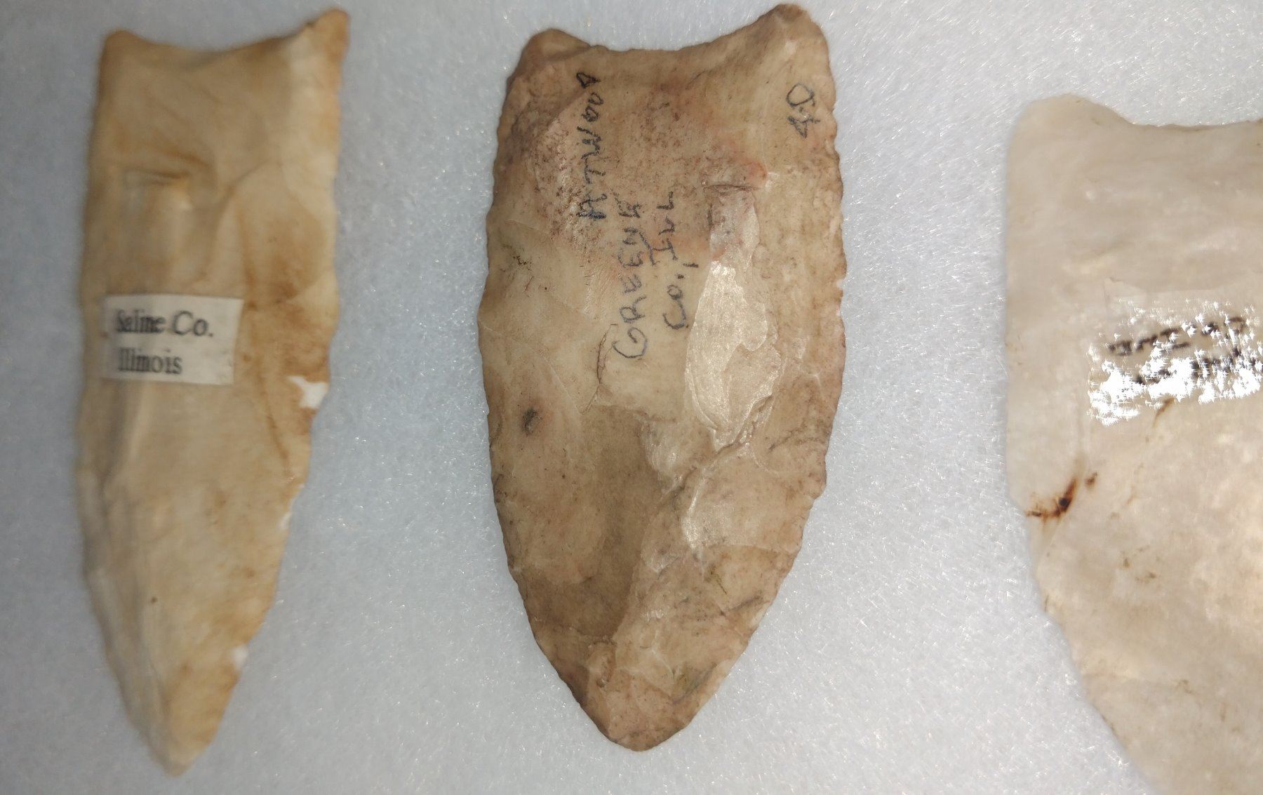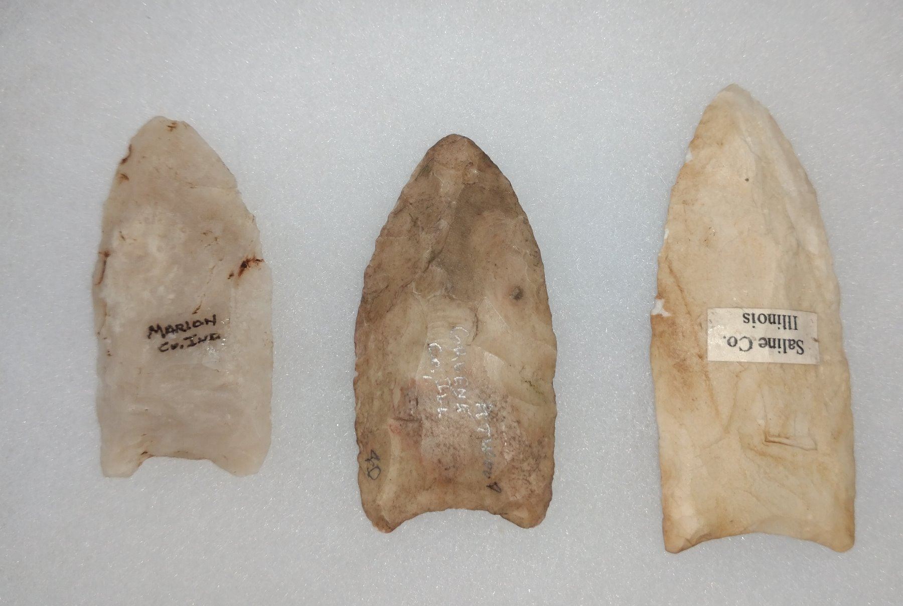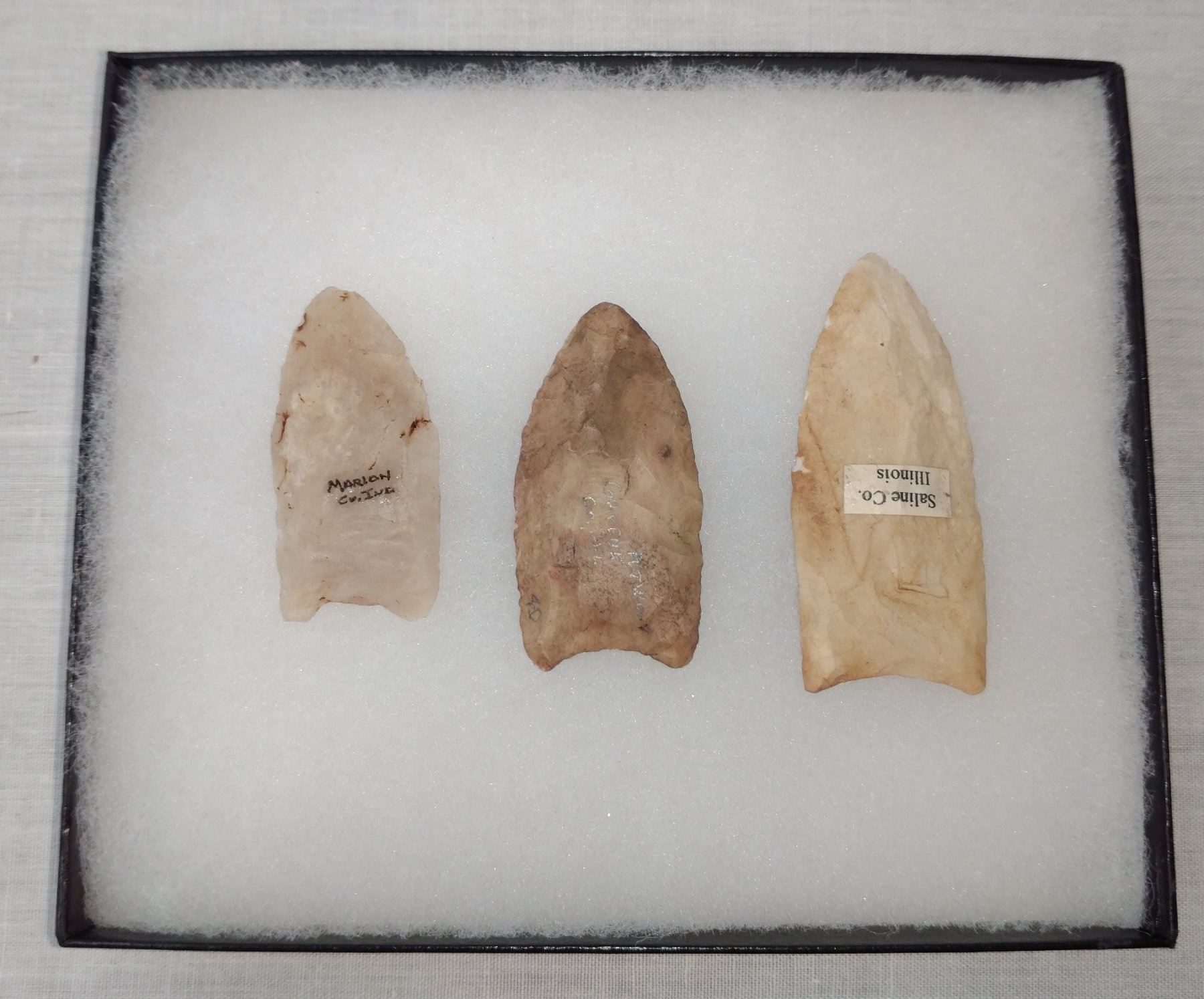 3 Fluted Points, pre-historic item. Made of quartz and chert, the longest measures 2 1/2". Indiana & Illinois. Frame not included. Condition: Good, see images. Shipping: $14.50 w/insurance and signature.