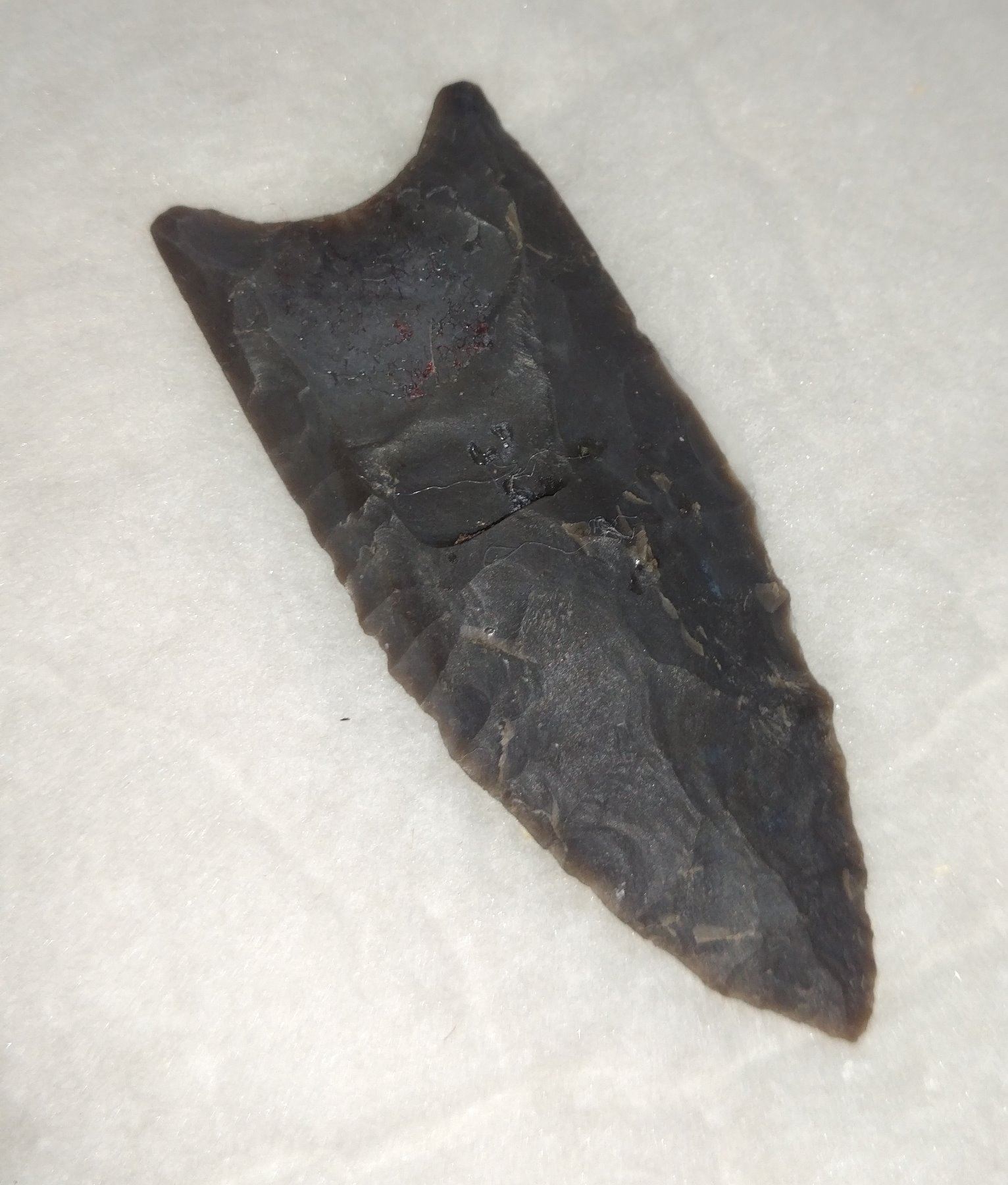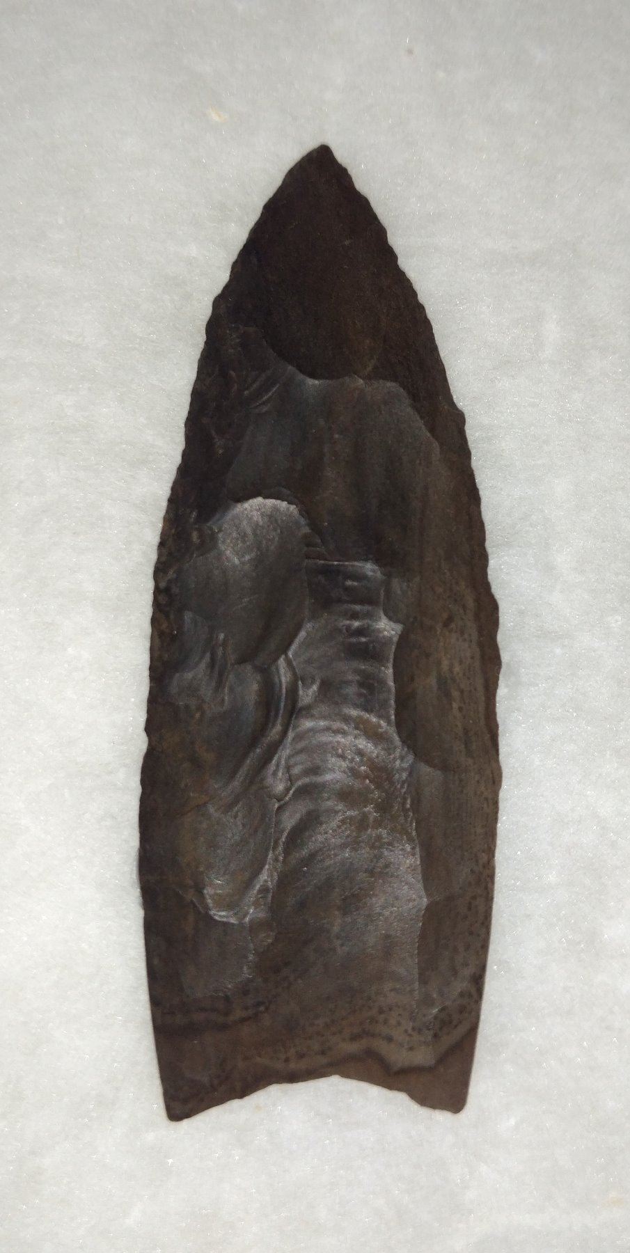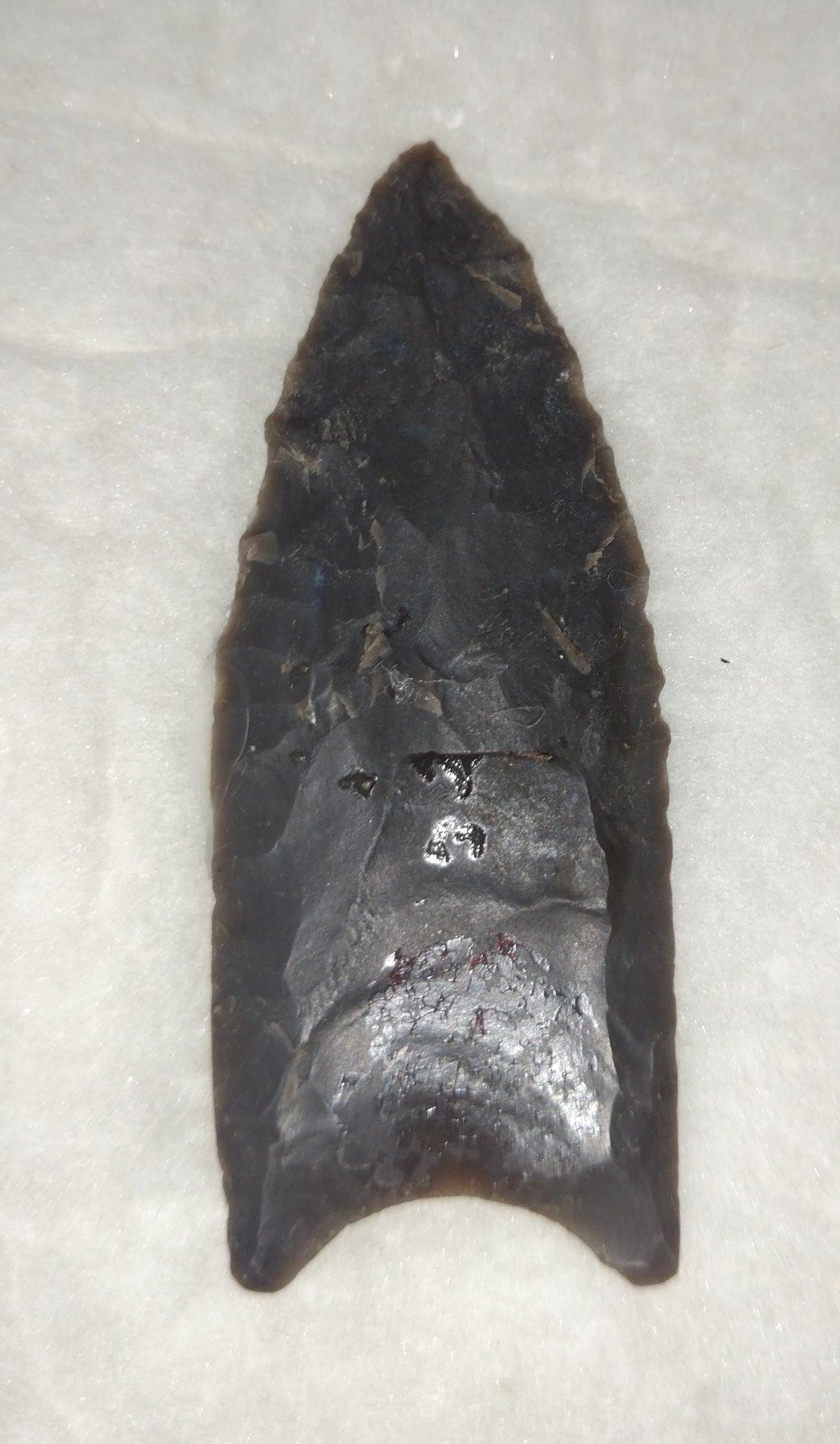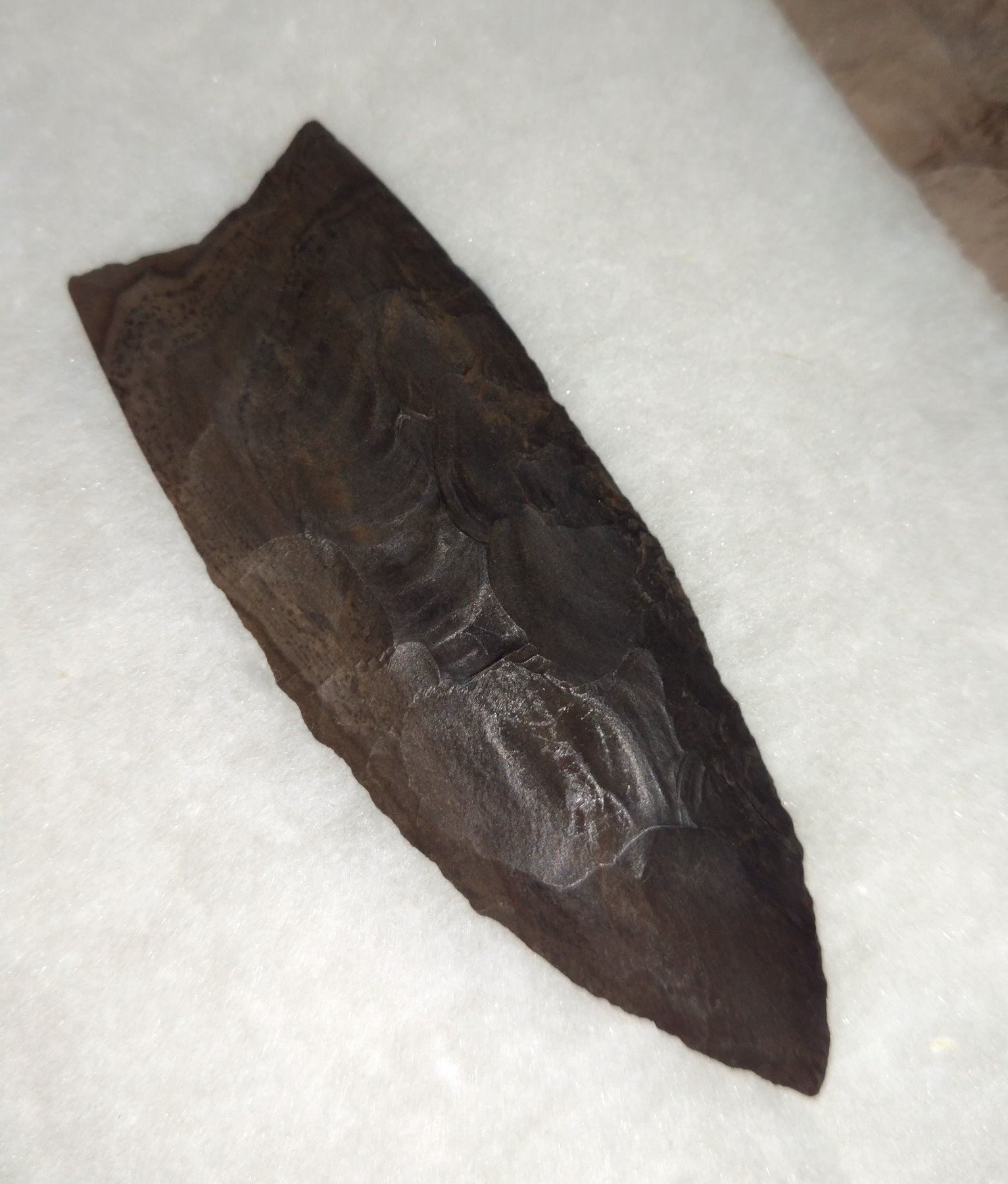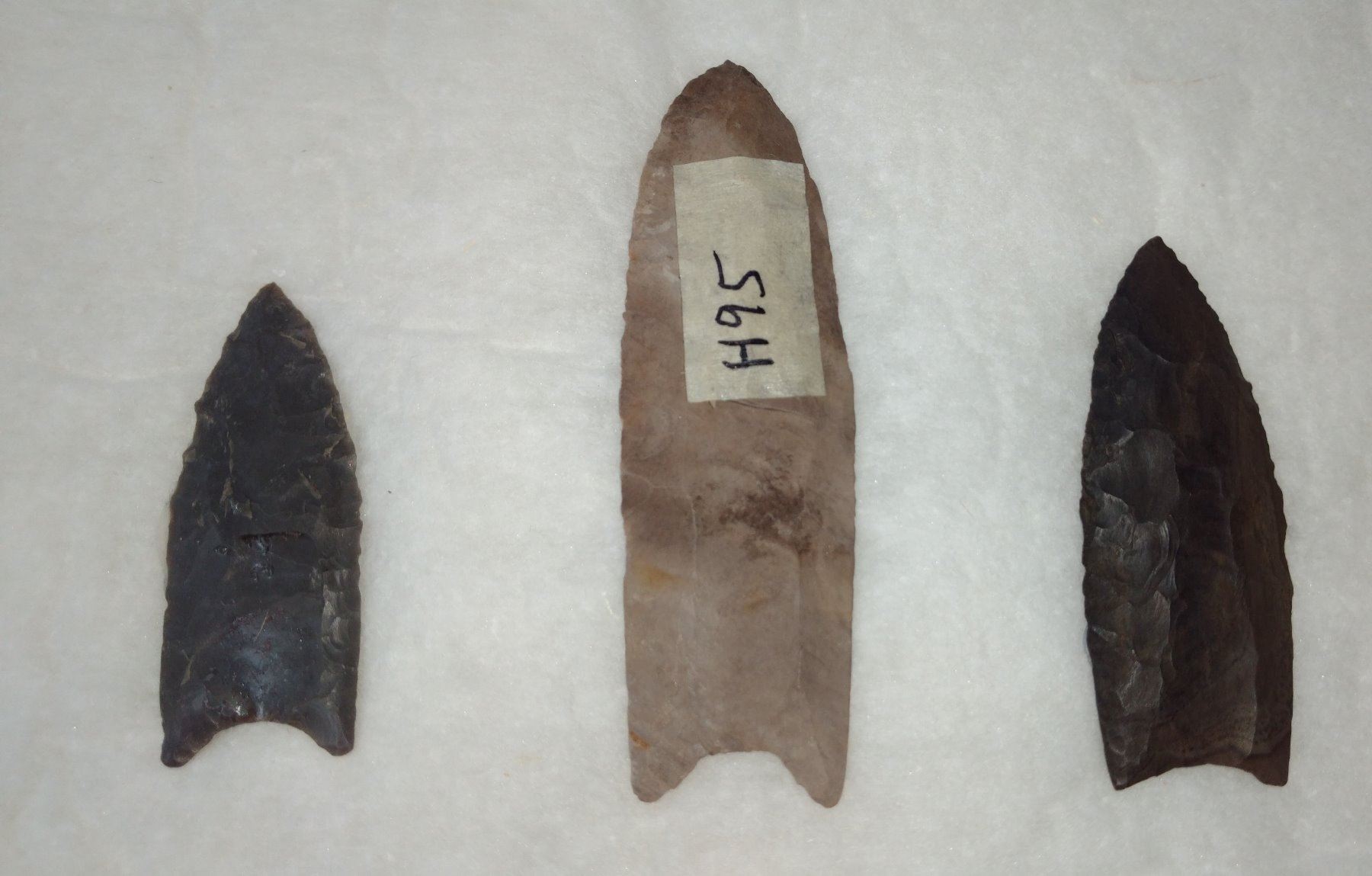 3 Fluted Points, pre-historic items. Made of dark chert, the longest item measures 4 1/4". Ohio. Fine fluted points. Frame not included. Condition: Good, see images. Shipping: $16.50 w/insurance and signature.
