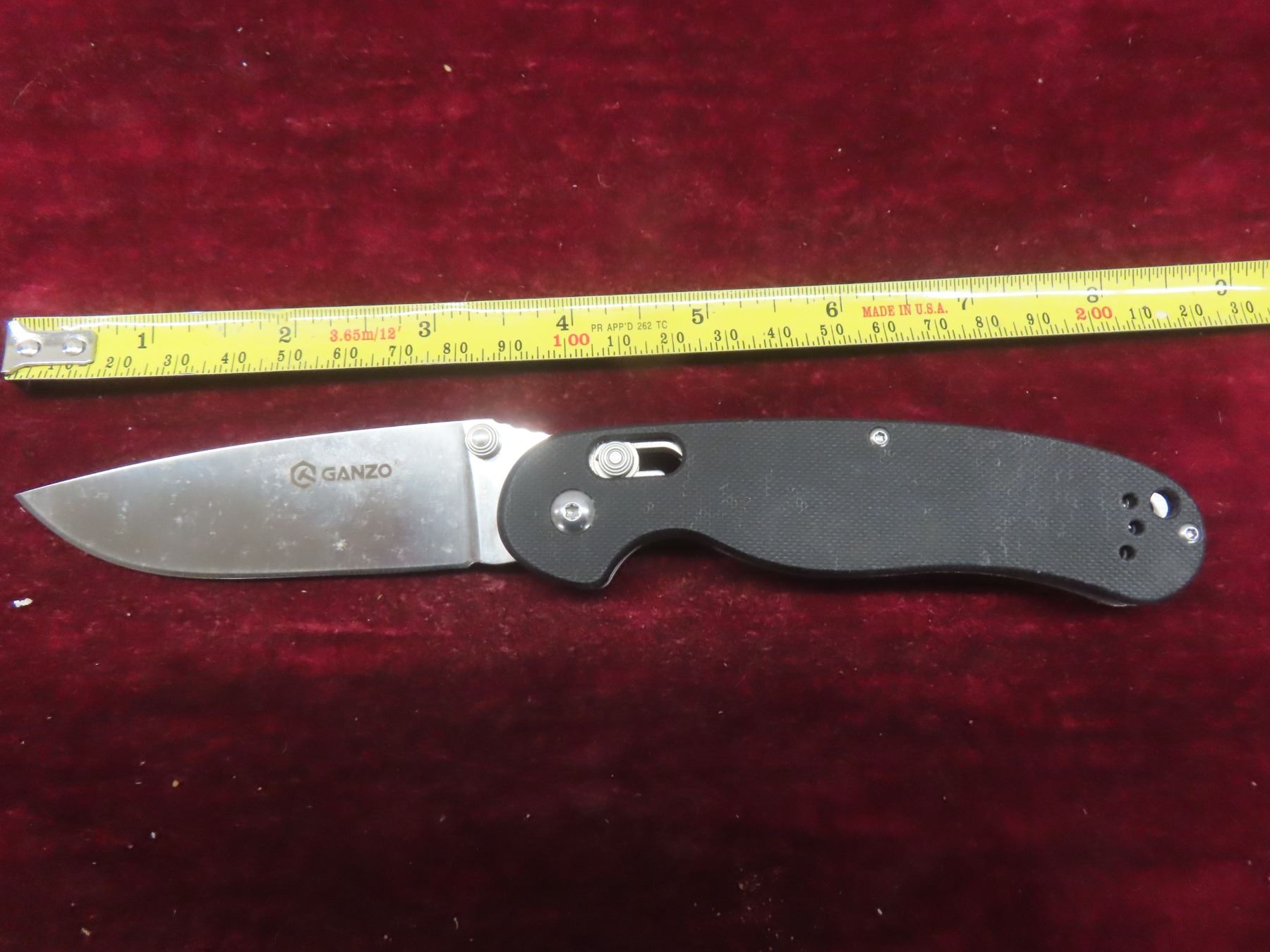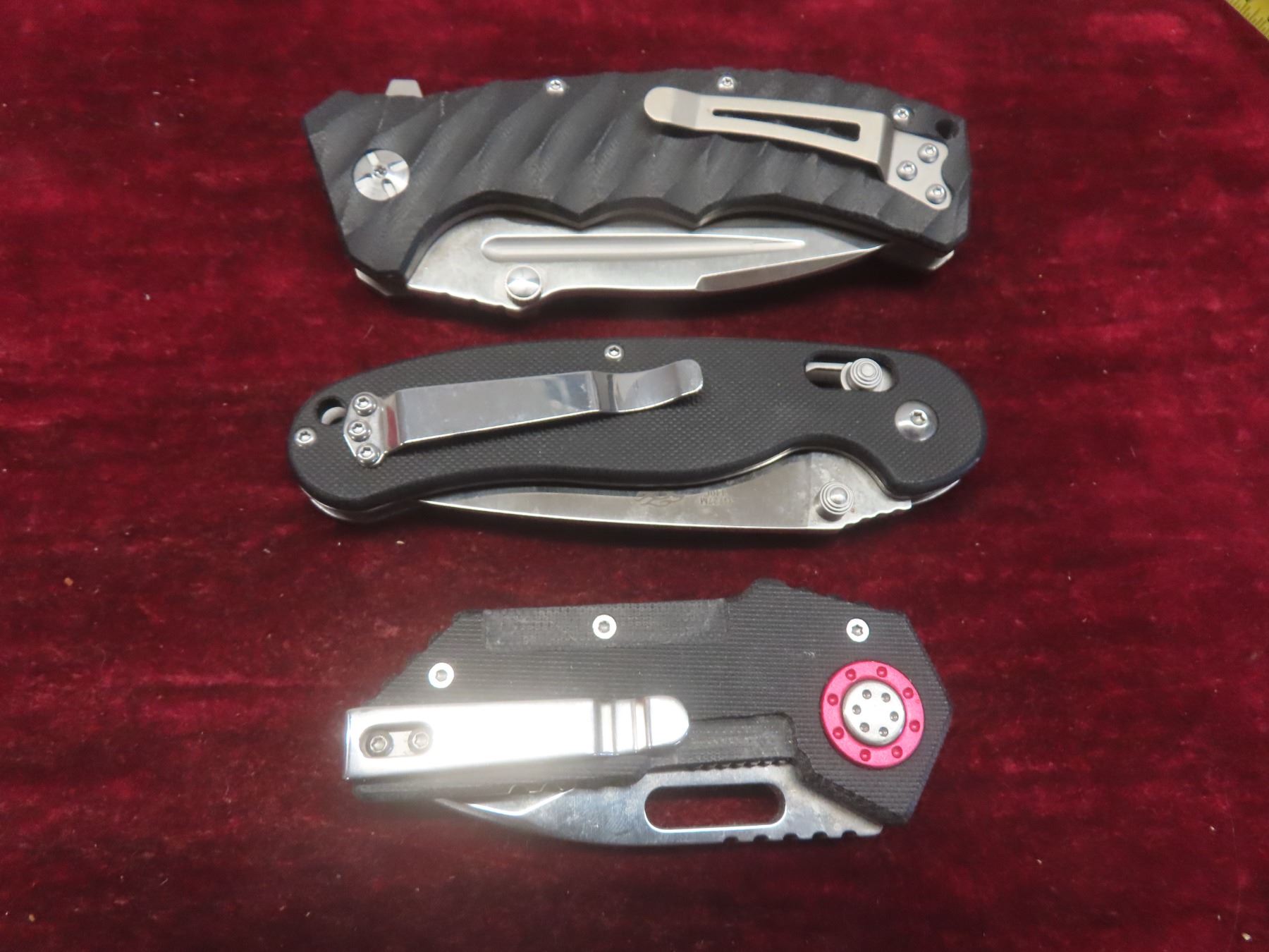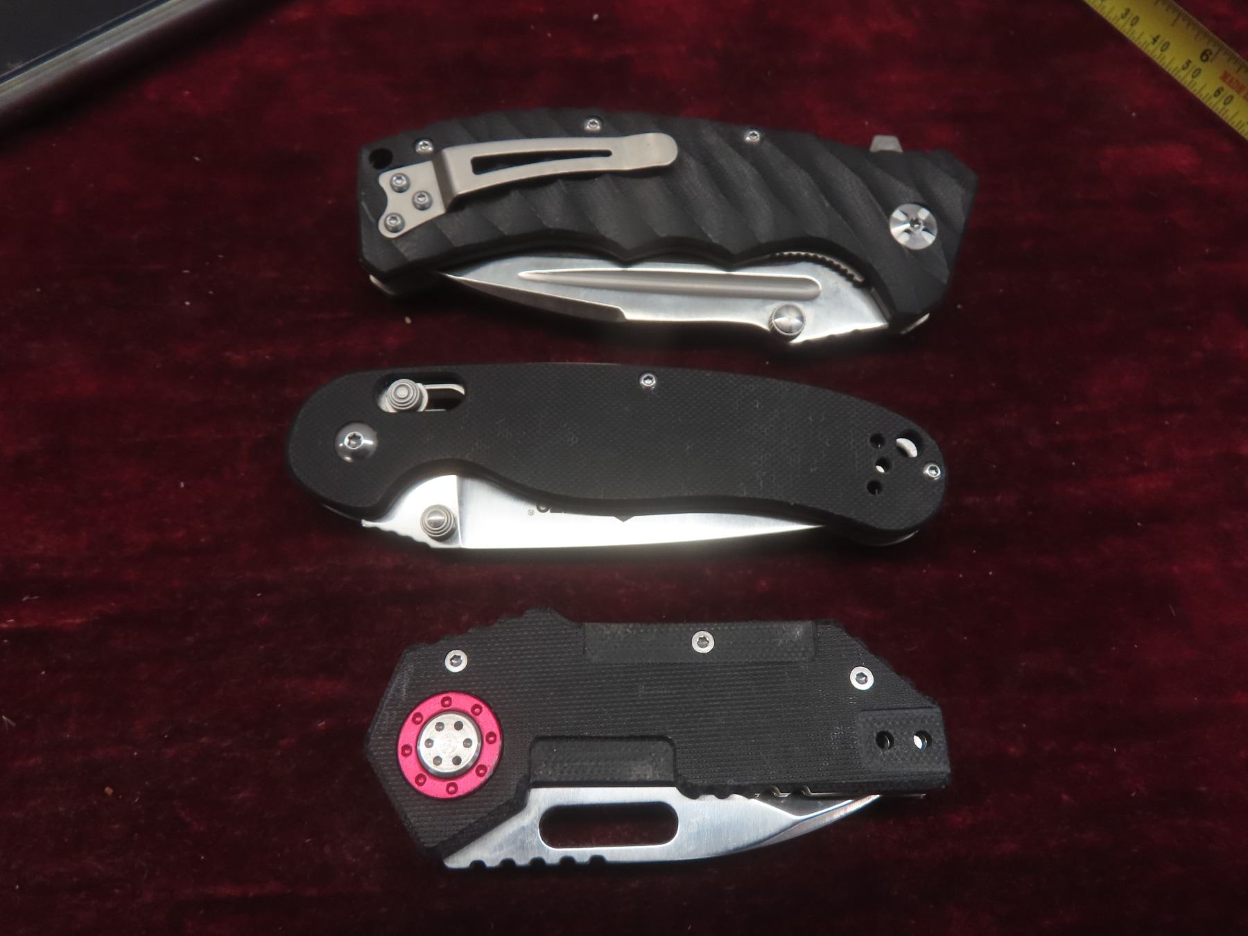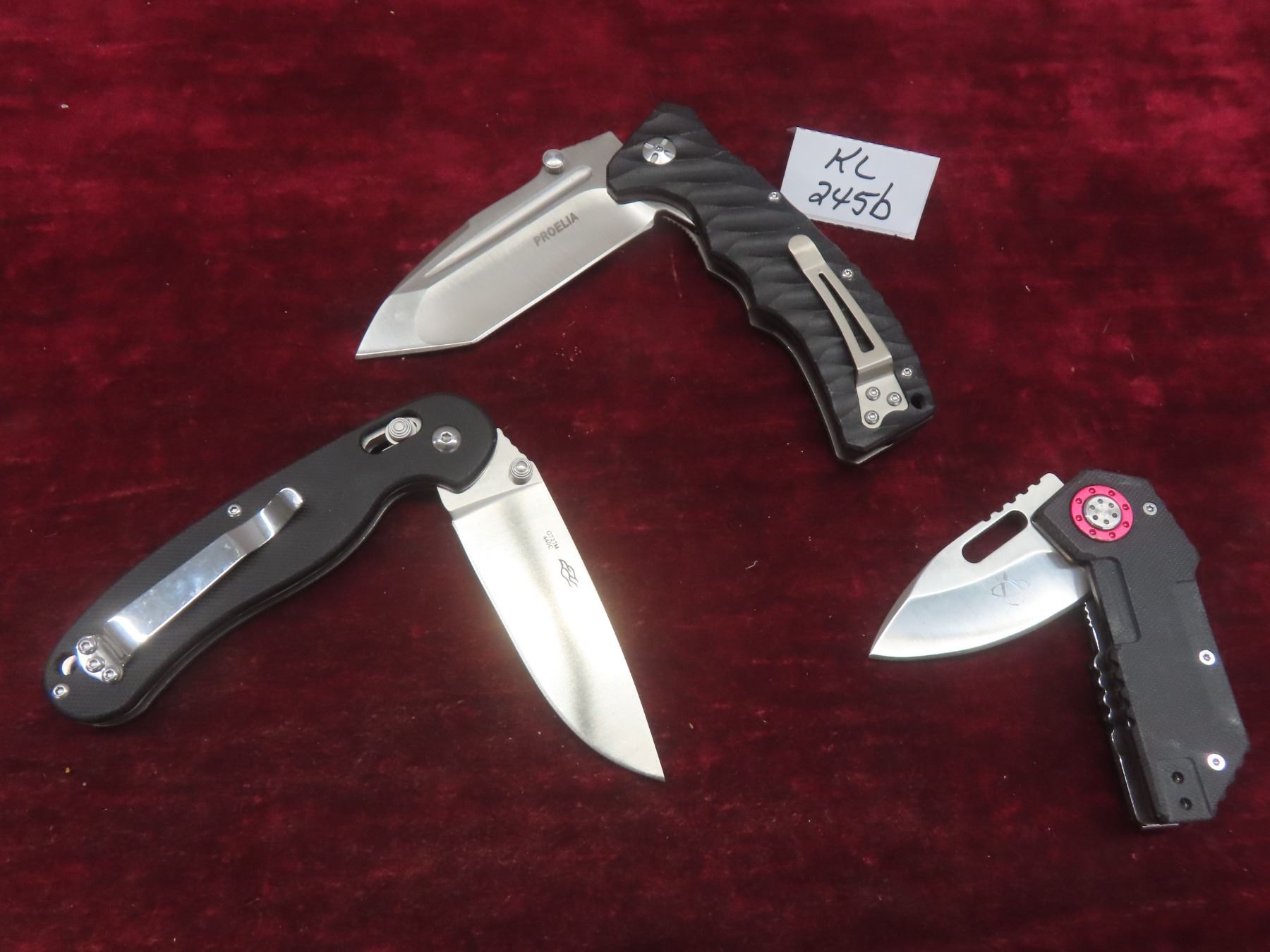 3 Folding Knives — Proelia (3 3/4" Blade, 8 1/2" Overall), Ganzo (3 3/4" Blade, 8" Overall), And Mantis (2 1/4" Blade, 6" Overall).