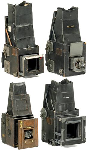 3 SLR-Kameras Graflex und Thornton-Pickard 1) Thornton-Pickard, England. "Ruby Reflex", um 1911, Format 9 x 13 auf Platte, Wollensak Verito 7 1/4 in./4, Schlitzverschluß bis 1/1000 Sek. (hängt). - 2) The Folmer Graflex Corporation, USA. "R. B. Graflex - Series B", ab 1923, mit Bausch & Lomb Tessar Serie I 5 x 7, Format 4 x 5 in., Schlitzverschluß läuft! - Und: 3) The Folmer Graflex Corporation. "Auto Graflex", ab 1906, ohne Objektiv, 4 x 5 in., Verschluß ohne Funktion, mit Rollfilmkassette. - Sowie: 4) The Folmer Graflex Corporation. "Home Portrait Graflex", ab 1912, Format 5 x 7 in., ohne Objektiv, Verschluß ohne Funktion. - Alle Kameras restaurierungsbedürftig.