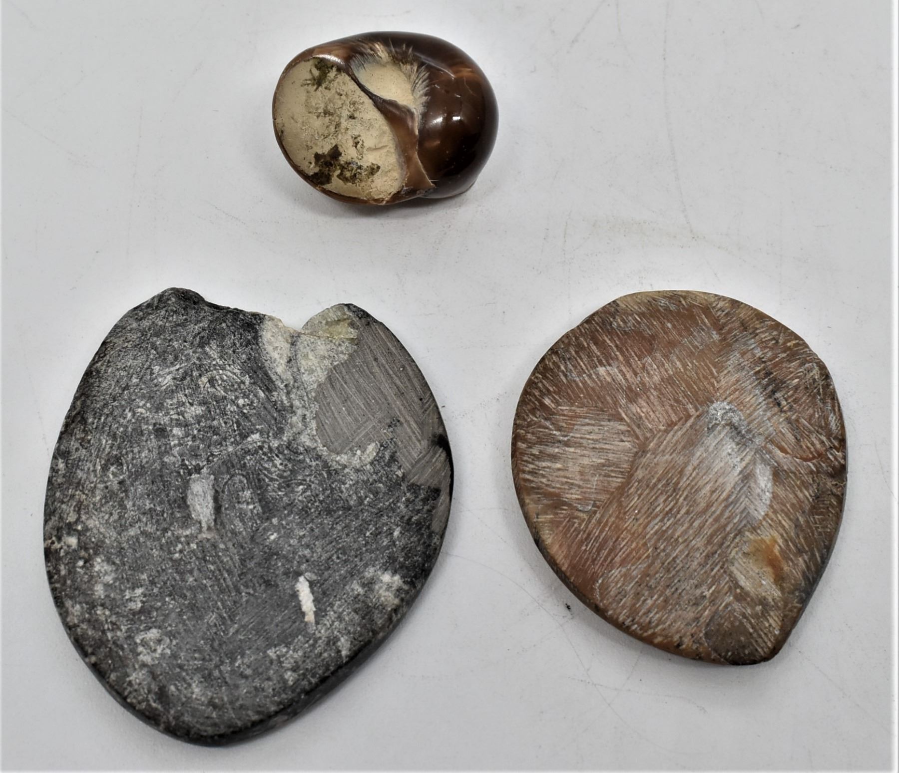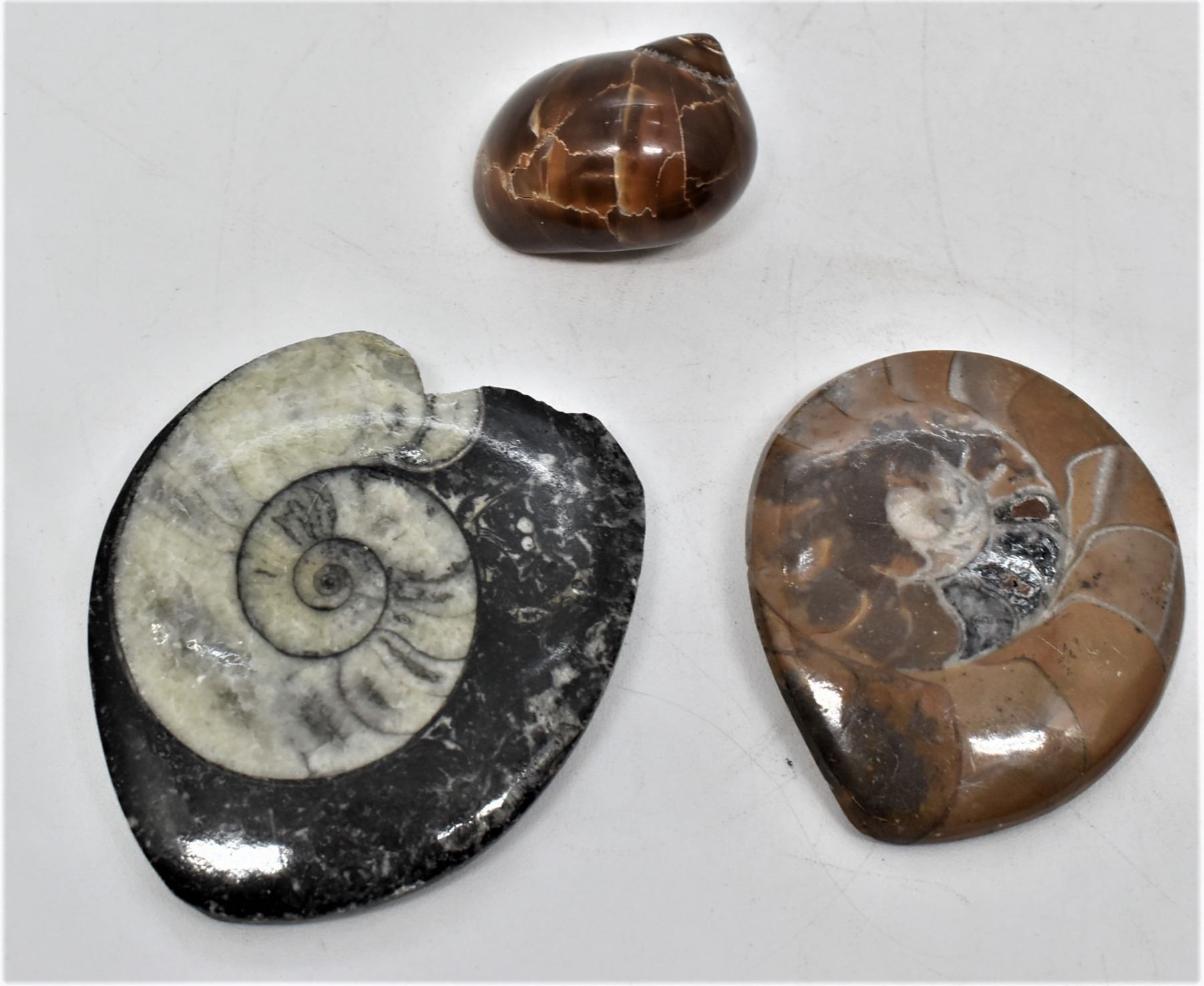 3 Fossils, includes opalized brown snail, and 2 ammonites, largest measures 2.5'' x 2.25''