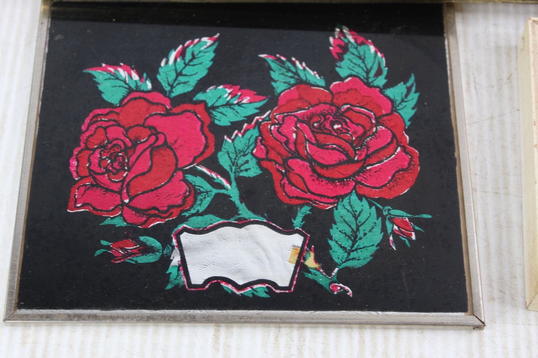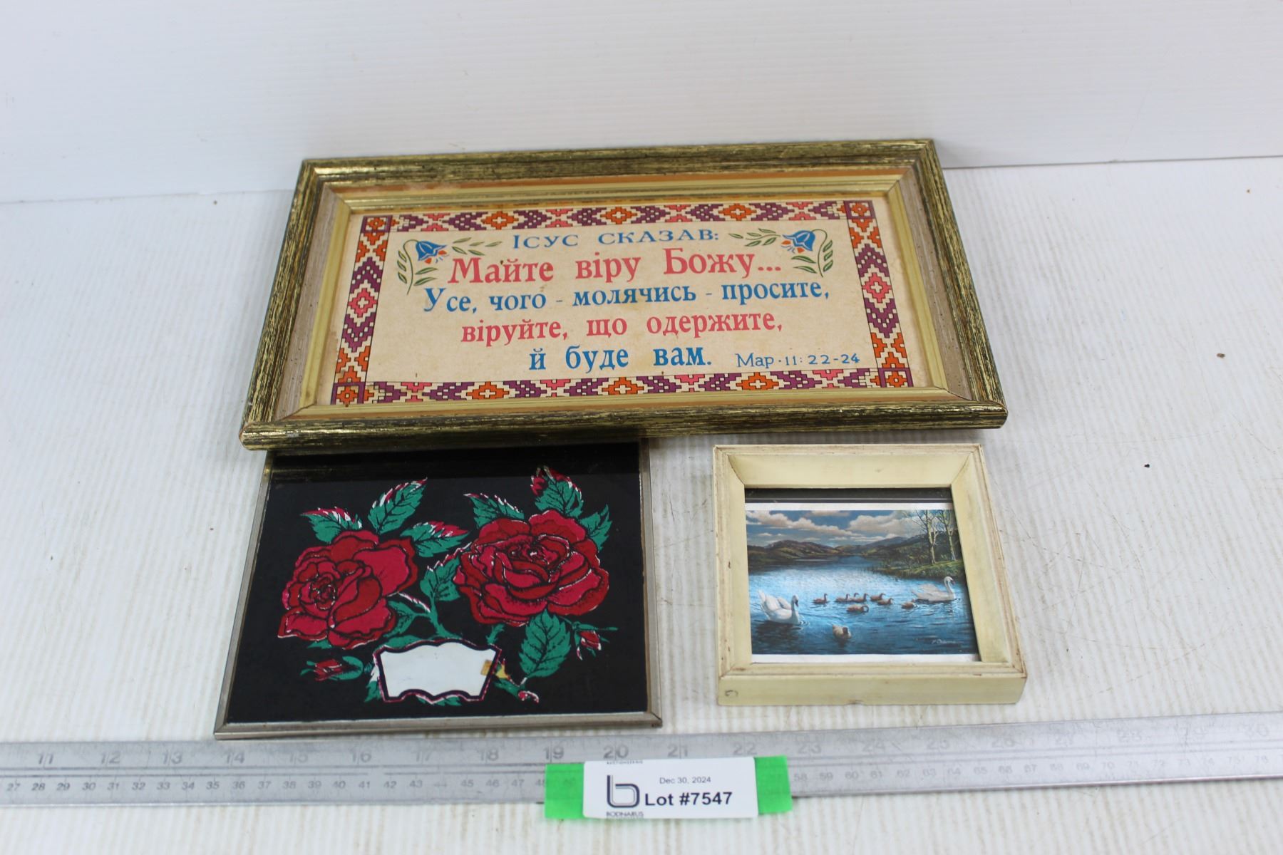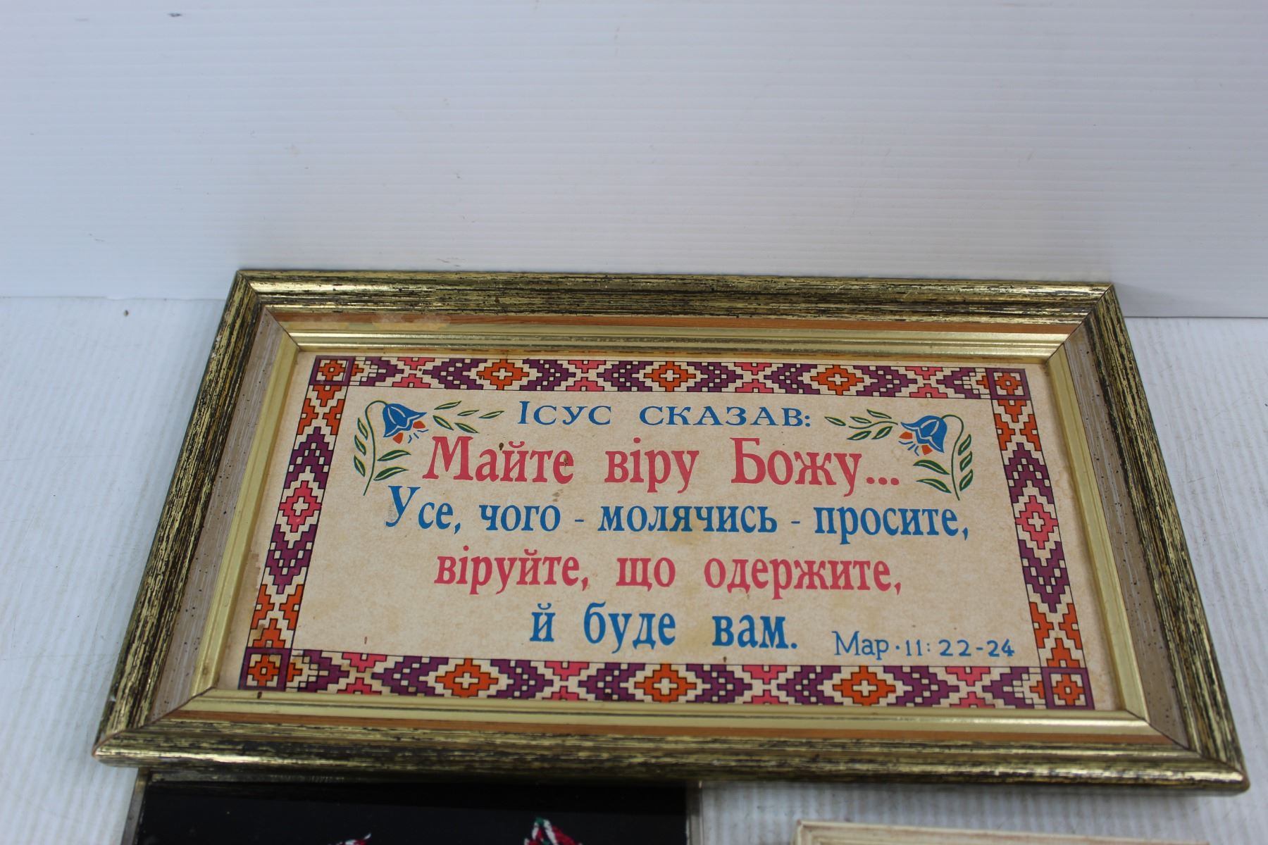 (3) Framed Pictures, Religious Ukrainian Bible quote, Framed Foil Rose Picture, Misc.- Largest Is 14'' x 8''