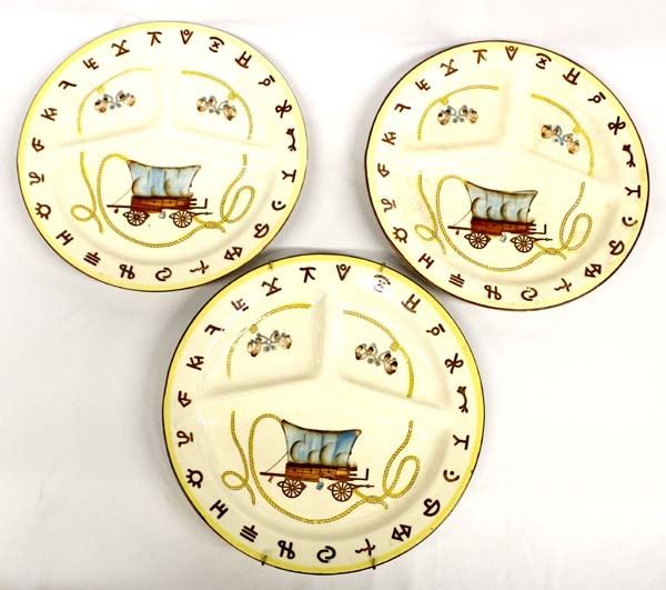3 Vintage Fred Roberts Western Ranch Motif Covered Wagon & Spurs Divided Plates, measures 11.25''D, made in Japan, pre-WWII