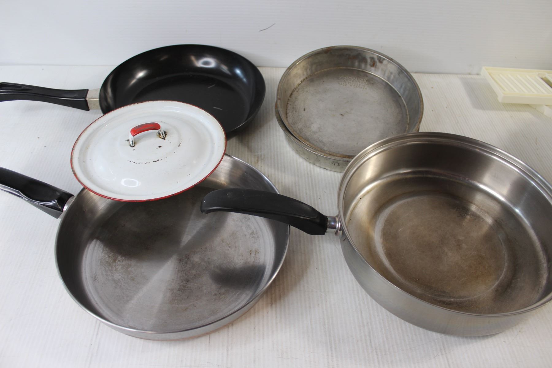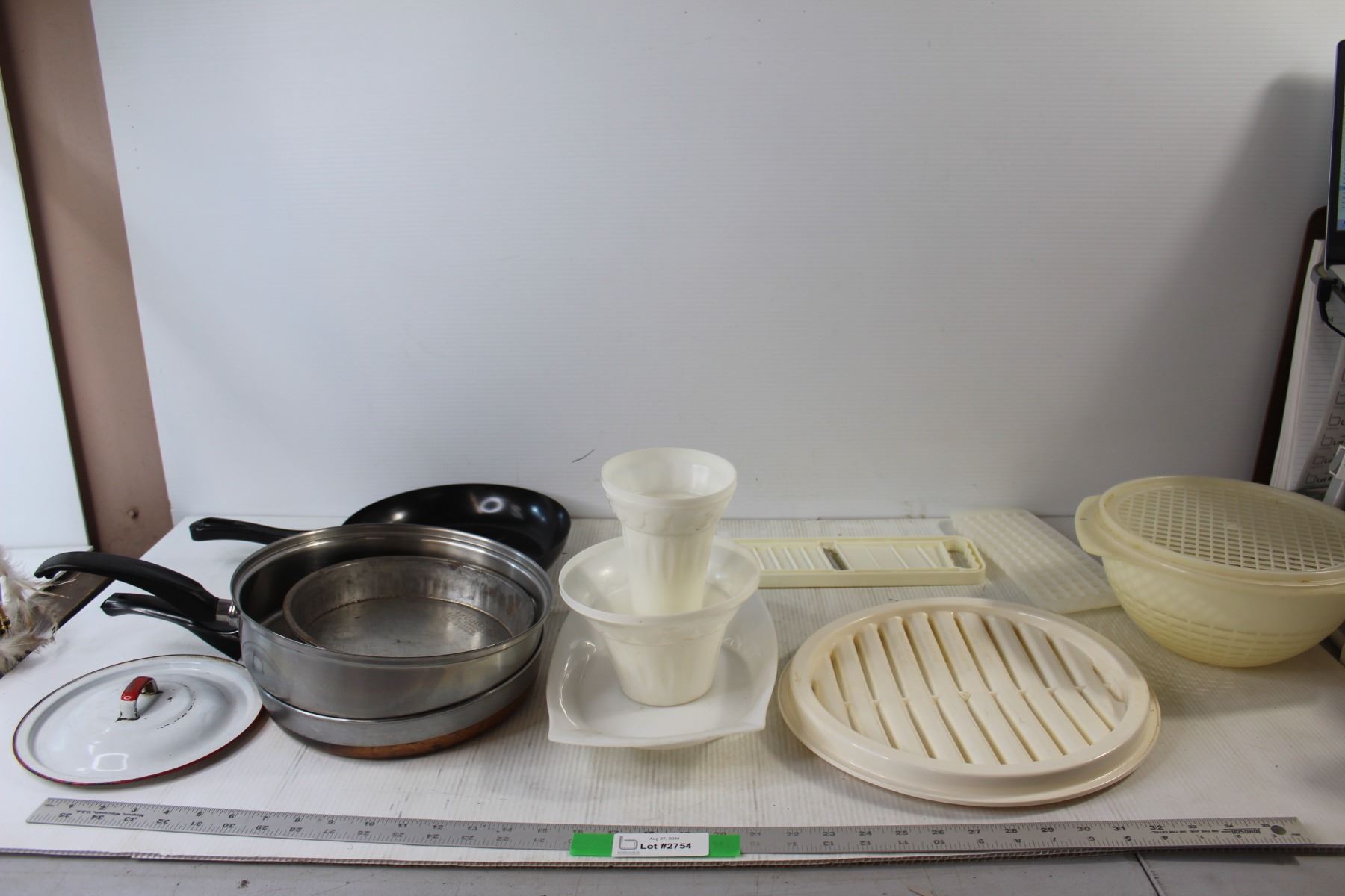 (3) Frying Pans, Colander, Metal Steamer Insert, Assorted Kitchen Items