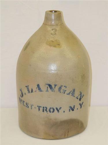 3 GAL. ADVERTISING STONEWARE JUG-J. LANGAN, WEST TROY NY, UNMARKED - STAINS & IMPERFECTIONS