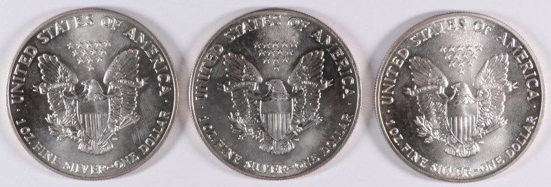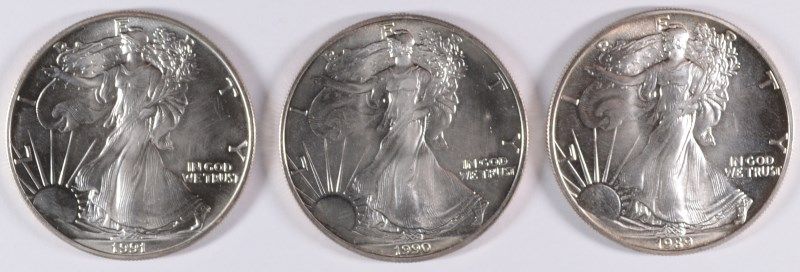 3 GEM BU AMERICAN SILVER EAGLES (1989,1990,1991)