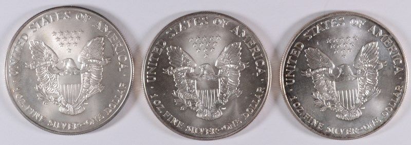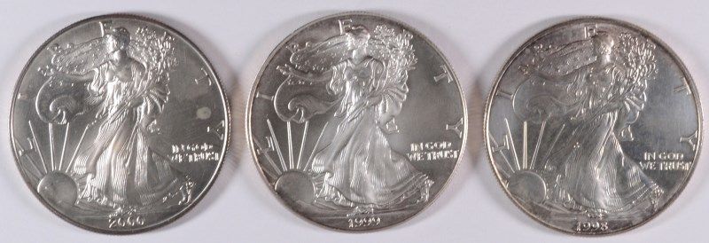 3 GEM BU AMERICAN SILVER EAGLES (1998,1999,2000)