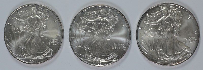 3 GEM BU AMERICAN SILVER EAGLES (2008,2009,2010)
