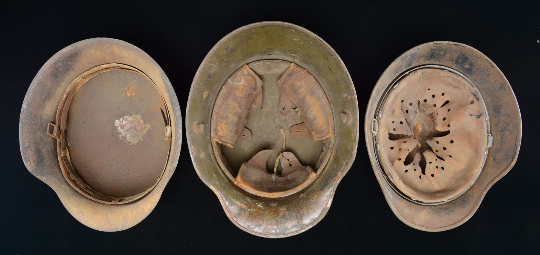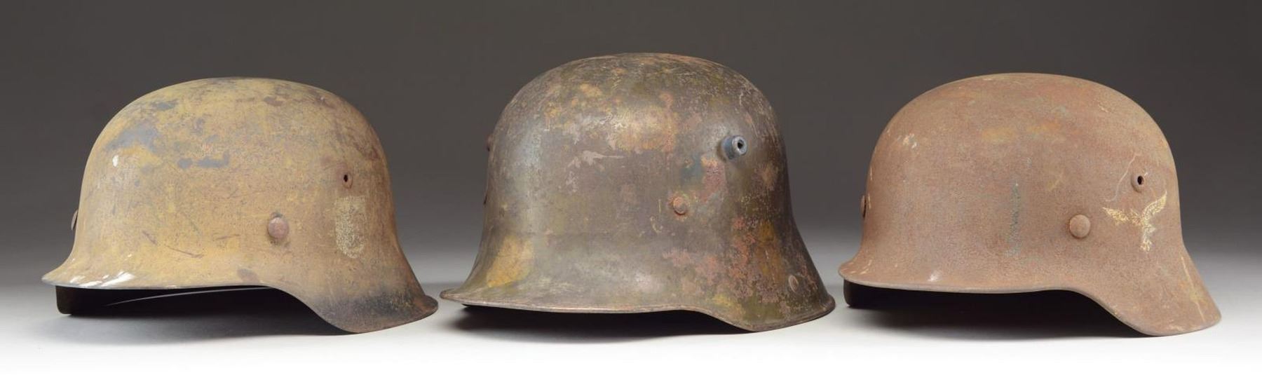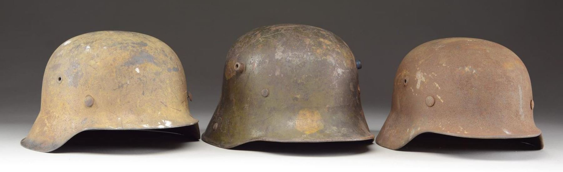 1) WWI. A good example of a German M1916/17 helmet. This helmet has a dark gray/green painted finish that may have, at one time, also had camouflage paint. The helmet has a 3-pad leather liner, and is stamped on the inside left “W66”. No chinstrap. CONDITION: helmet finish is about 50%. Liner is dry & worn but present. 2) WWII. An example of a German single decal Luftwaffe M1940 helmet. Helmet has a dark gray/blue finish with a single Luftwaffe decal on the left side. Liner is complete. No chinstrap. Helmet is stamped on the inner left “SE64”, and on the inner rear “4419”. CONDITION: helmet body has an overall oxidized patina with only traces of original finish. The liner is present but exceptionally dry. 3) WWII. An example of a relic German M1942 helmet that seems to have the remnants of a tan painted finish. There are also the remnants of an Afrika Corps decal on the left side. No liner or chinstrap, but the band is present. CONDITION: helmet has an overall oxidized patina with a few areas that appear to show tan camouflage paint. The decal is about 10% intact and is probably Afrika Corps. The inner band is oxidized. (02-20914/BF). $700-1,000.