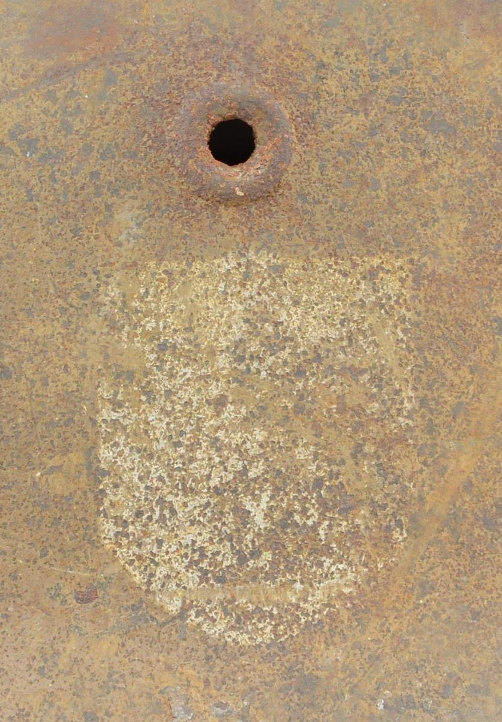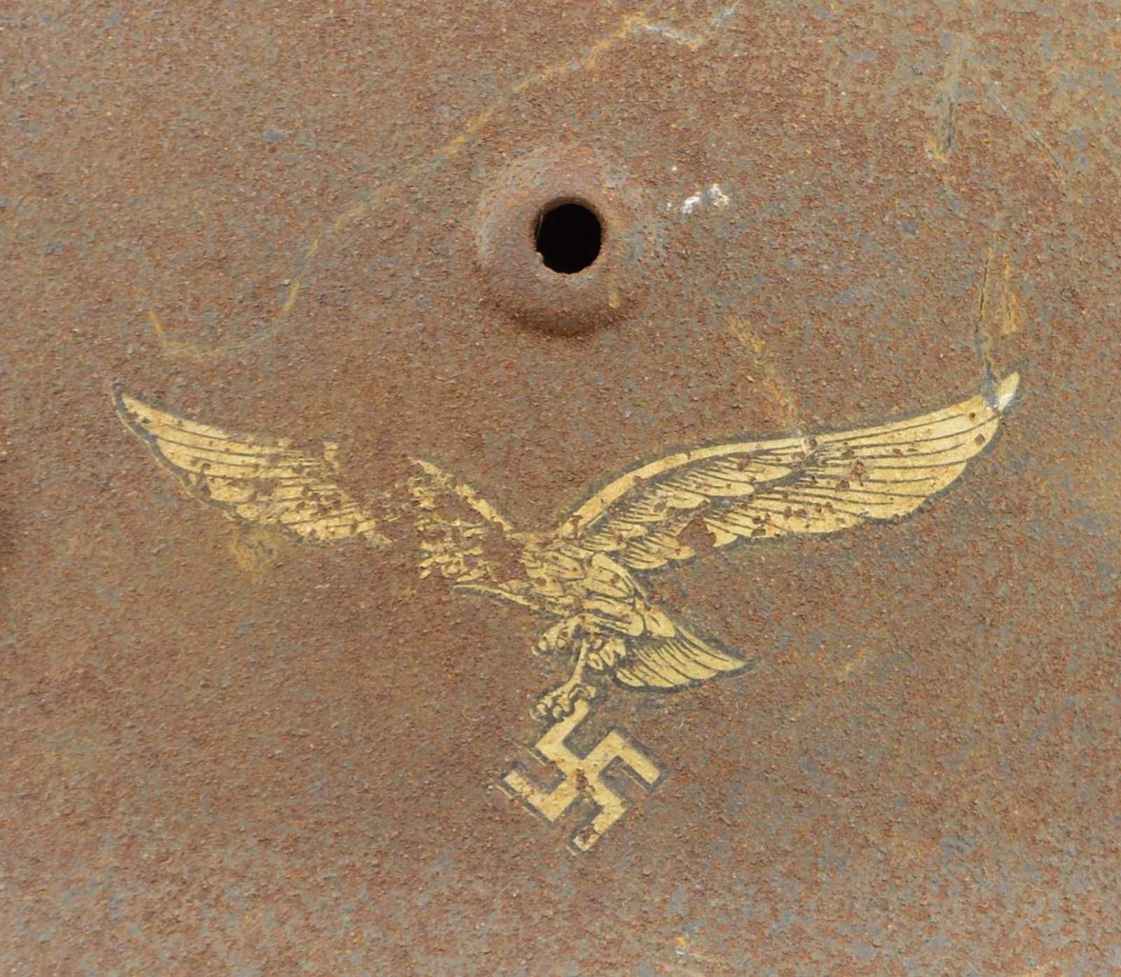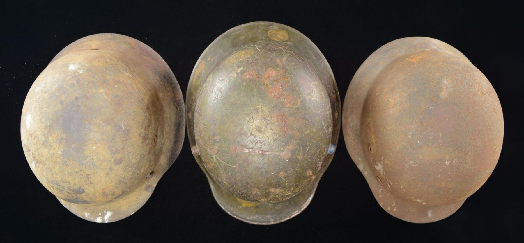 1) WWI. A good example of a German M1916/17 helmet. This helmet has a dark gray/green painted finish that may have, at one time, also had camouflage paint. The helmet has a 3-pad leather liner, and is stamped on the inside left “W66”. No chinstrap. CONDITION: helmet finish is about 50%. Liner is dry & worn but present. 2) WWII. An example of a German single decal Luftwaffe M1940 helmet. Helmet has a dark gray/blue finish with a single Luftwaffe decal on the left side. Liner is complete. No chinstrap. Helmet is stamped on the inner left “SE64”, and on the inner rear “4419”. CONDITION: helmet body has an overall oxidized patina with only traces of original finish. The liner is present but exceptionally dry. 3) WWII. An example of a relic German M1942 helmet that seems to have the remnants of a tan painted finish. There are also the remnants of an Afrika Corps decal on the left side. No liner or chinstrap, but the band is present. CONDITION: helmet has an overall oxidized patina with a few areas that appear to show tan camouflage paint. The decal is about 10% intact and is probably Afrika Corps. The inner band is oxidized. (02-20914/BF). $700-1,000.