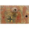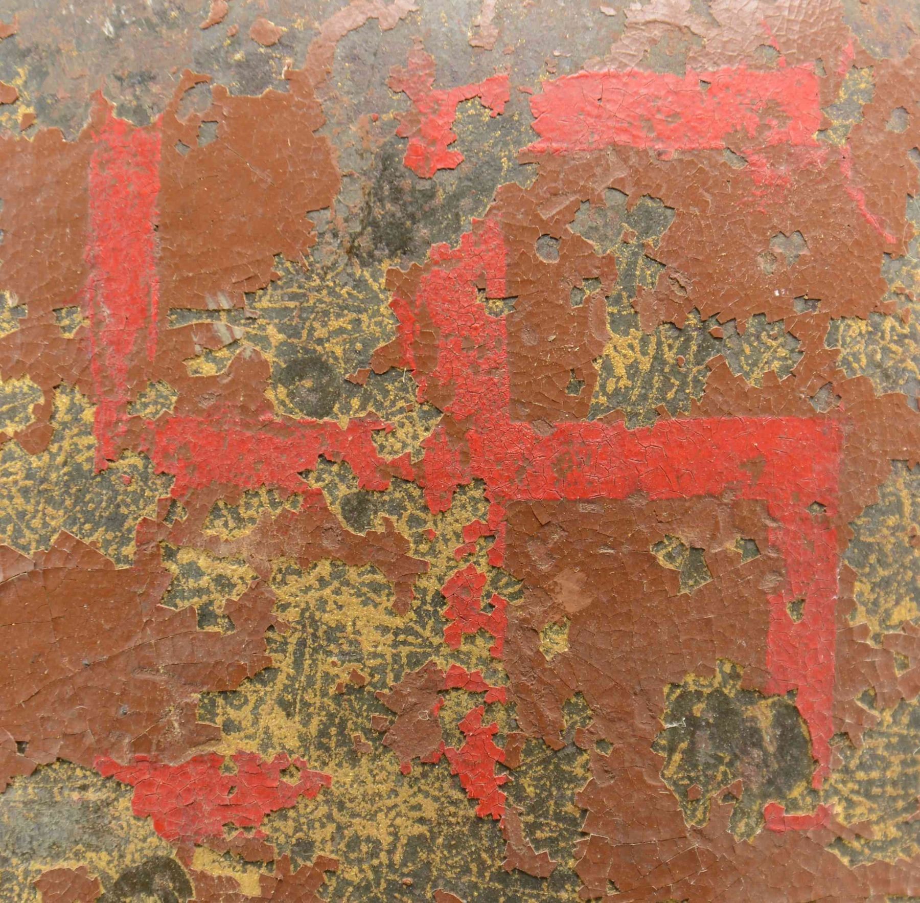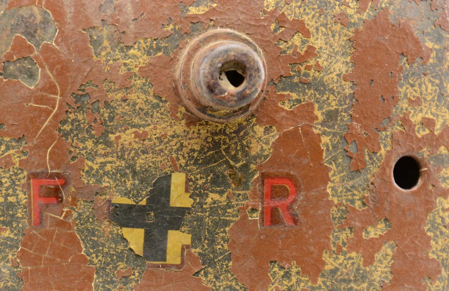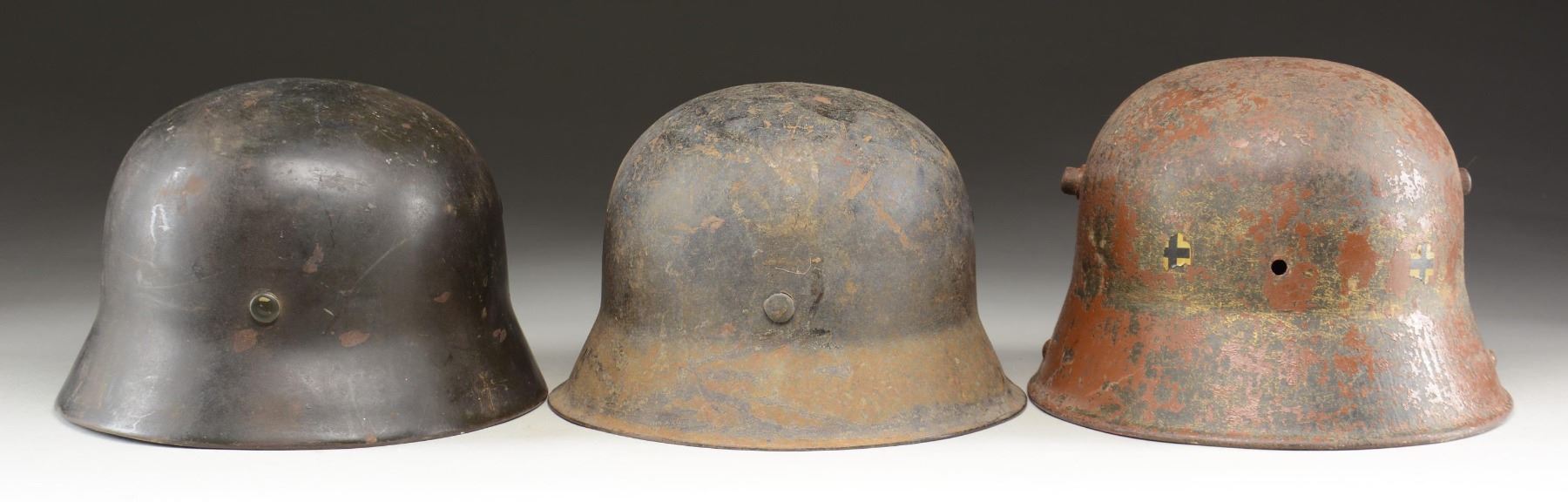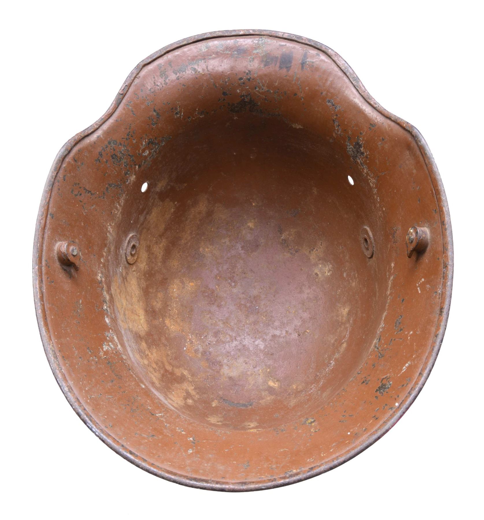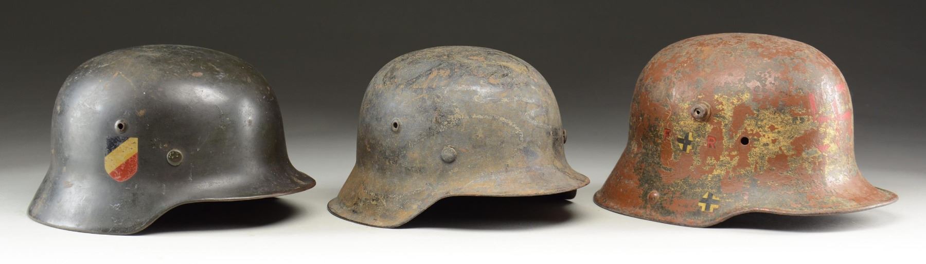 3) M1916. A repainted shell of a German M1916/17 helmet. Both the interior and exterior have been painted brown. The front has a painted red WWII German Party symbol, and the sides have a total of six black cross decals, as seen on German model planes. There is no liner, chinstrap, or band. CONDITION: helmet is in relic condition. (02-22919-1/BF). $800-1,200.