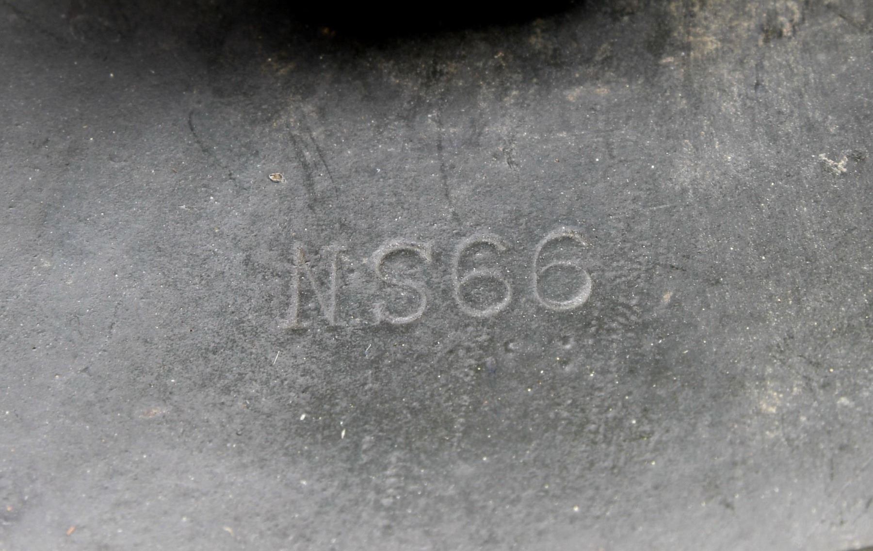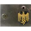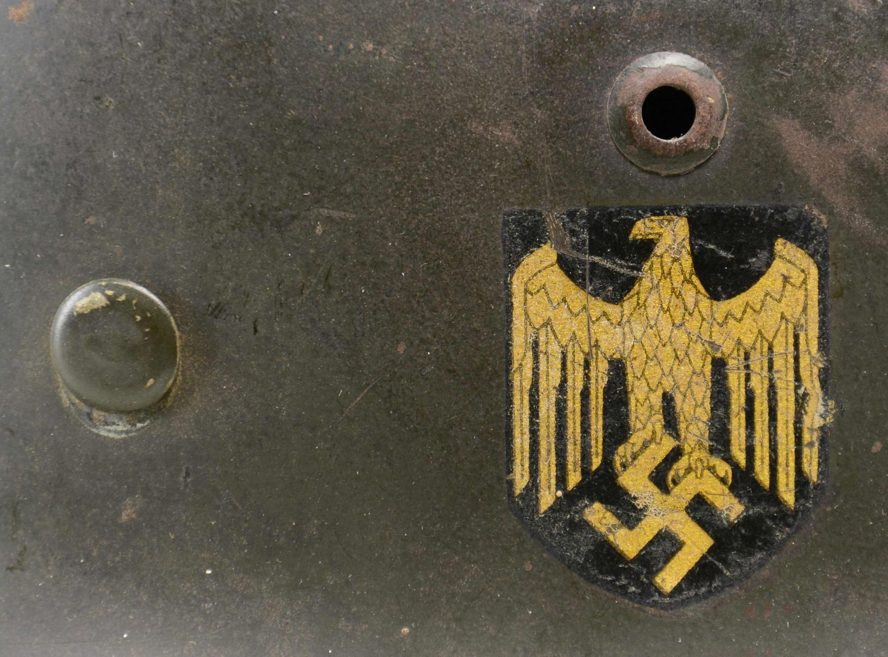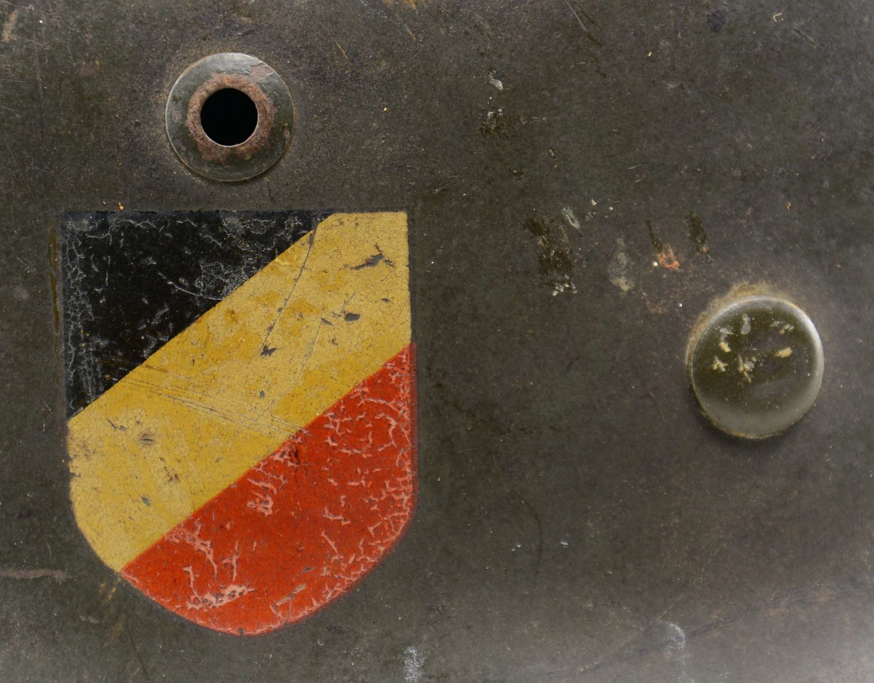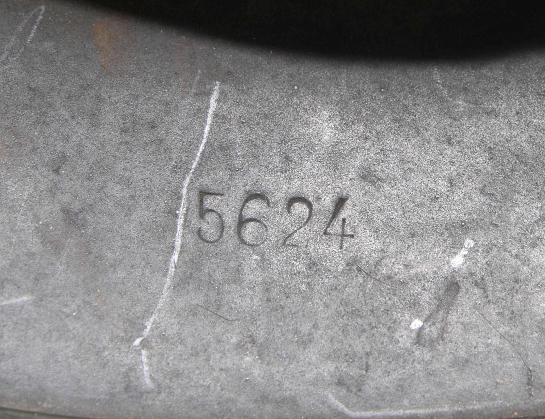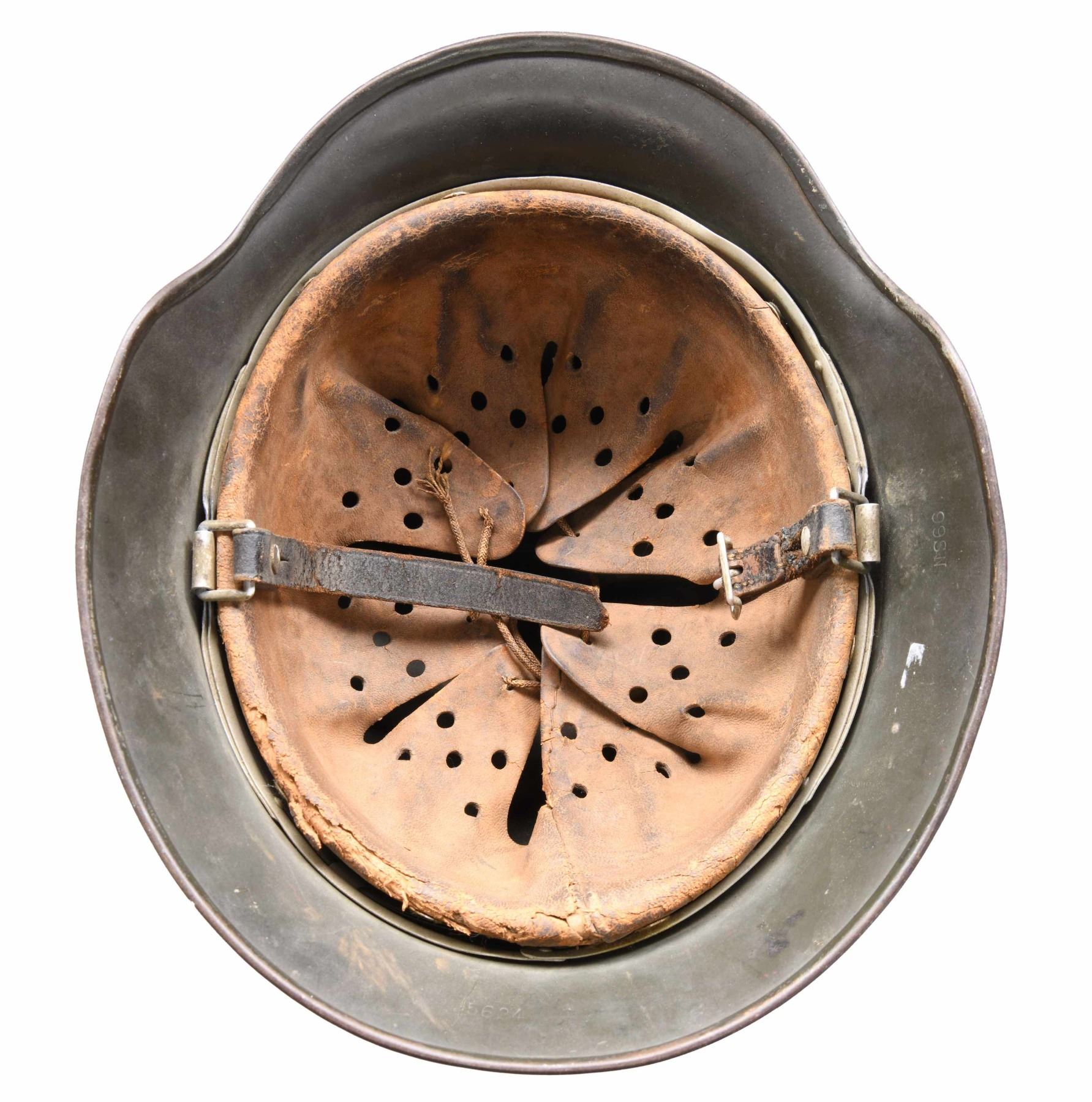 1) M1935. A very nice example of a German M1935 double-decal Kriegsmarine helmet with a dark gray-painted finish. There is a gold Wehrmacht-style decal on the left with a national colors decal on the right. The interior rear is stamped "5624,” and the interior left is stamped “NS66.” Brown leather 8-tab liner with black leather chinstrap. CONDITION: helmet finish is better than 90%. Kriegsmarine decal and the national decal are both better than 90%. Liner is a tiny bit dry but complete with normal wear. Chinstrap is broken on the adjustable side. It is likely that item #1 is a Wehrmacht Helmet that has a tones decal and not a Kriegsmarine helmet.