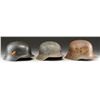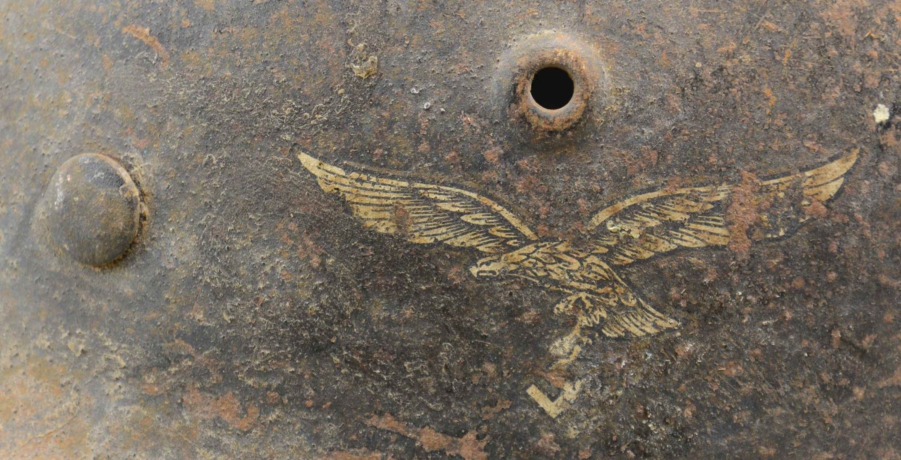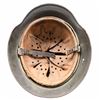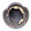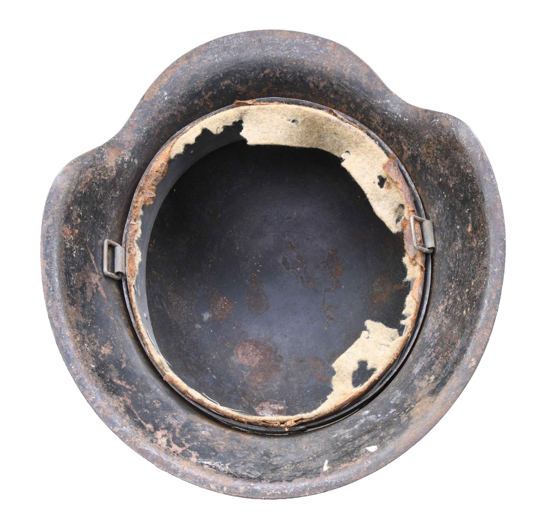 2) M1942. A well-used example of a German Luftwaffe M1942 helmet. The helmet has a dark gray-painted finish with a single Luftwaffe decal on the left side. The interior rear is stamped “hk 62” and "2380." There is no stamp on the interior left. There is no liner or chinstrap. CONDITION: helmet finish is about 50%. Decal is about 60%. The interior band is intact.