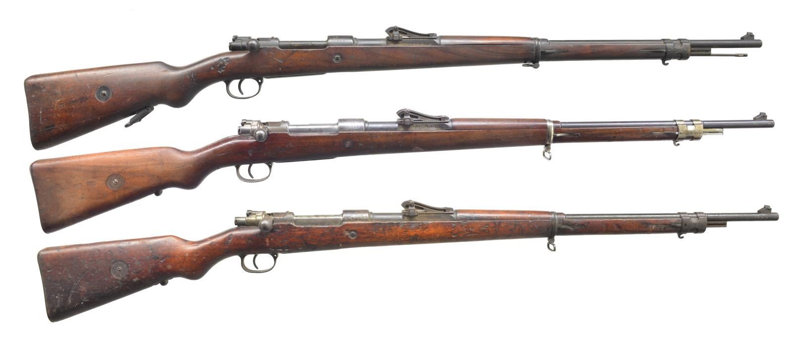 ALL: cal. 8 mm Mauser. Bbls. 29". 1) S# 8732D. S# matches on receiver, bbl., rear sight, bbl. bands, trigger guard & buttstock. Receiver marked on left side "GEW.98", receiver ring marked on top "SIMSON & CO SUHL 1916". Straight bolt handle. Lange rear sight graduated to 2000m. Inverted V front sight. Cleaning rod is present. Upper band has parade hook. Matching walnut stock set. Buttstock has faint Imperial acceptance marks on right side. Metal disk appears unmarked. Butt has correct QD swivel. CONDITION: stock set has moderate wear, dents, scratches & staining. Has noticeable large crack extending from buttplate to above swivel base on both sides. Has deep gouge on right side above trigger guard. Has loss of finish on left side over trigger guard. Metal has turned overall patina w/ wear, light oxidation & fine pitting. Fair worn bore turning dark in grooves. (20-2955/RW). CURIO. 2) S# 1003K. Numbers match on receiver, bbl., trigger guard, buttstock & rear sight. Rifle has been converted to drill rifle by inserting full-length plug in bore. Bolt has been modified by grinding off forward end & extractor. Firing pin tip has been removed. Mainspring has broken coils. Straight bolt handle. Lange rear sight graduated to 2000m. Inverted V front sight. Cleaning rod is not present. Upper band has parade hook. Walnut stock set. CONDITION: stock set has extensive wear, dents, scratches & gouges commensurate w/ extremely hard service. Has notable gouge & crack on left side forward of trigger guard. Acceptance marks are obscured. Marking disk is oxidized. Metal has traces of blue turning gray & patina w/ oxidation & fine pitting throughout. Bore is plugged. (20-2968/RW). CURIO. 3) S# 262. Numbers match on receiver & bbl. Bolt body, trigger guard & upper band have been renumbered to match. Left receiver rail marked "GEW.98". Receiver ring on top has "DWM" markings. Also includes "BERLIN 1915". Bbl. marked over chamber "S". Lange rear sight graduated to 2000m. Inverted V front sight. Straight bolt handle. Cleaning rod is not present. Upper band has parade hook. Walnut stock set. Buttstock marked at bottom w/ Imperial acceptance marks. Also marked on right side of butt w/ Imperial acceptance marks. Disk is unmarked. CONDITION: stock has moderate wear, dents, staining & scratches over original finish. Metal turning gray & patina w/ traces of blue w/ oxidation & fine pitting. Trigger guard, bbl. bands & bayonet lug have been plated bright w/ thinning, flaking & yellowing. Fair worn bore. (20-2986/RW). CURIO. $600-900.